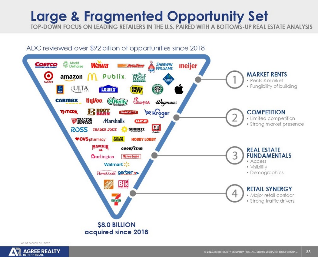 22©2025同意房地产公司。保留所有权利。机密。ADC一直在投资什么?随着市场力量造成颠覆和变化,零售格局继续动态演变。为了在持续中断的时期降低风险,公司坚持多项投资标准,重点关注四项核心原则:关注在全渠道结构方面已经成熟的领先运营商或那些在电子商务抵抗领域的运营商OMNI-Channel Critical(E-Commerce Resistance)强调平衡的投资组合,投资于逆周期行业和信用状况强劲的零售商经济衰退抵抗力强烈强调拥有强大资产负债表的领先运营商和避免私募股权赞助的零售商避免私募股权赞助保护我们的自上而下的投资理念发生不可预见的变化强大的房地产基本面和可融资建筑