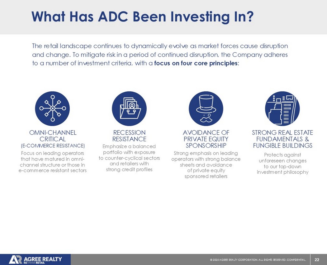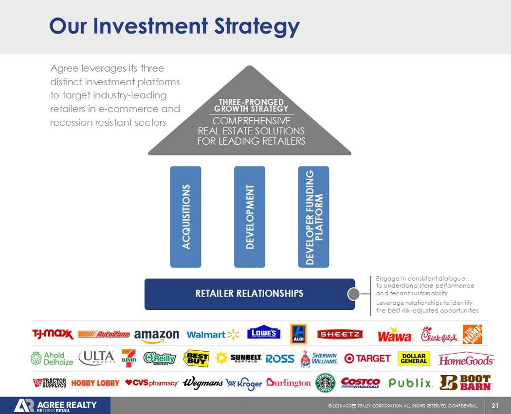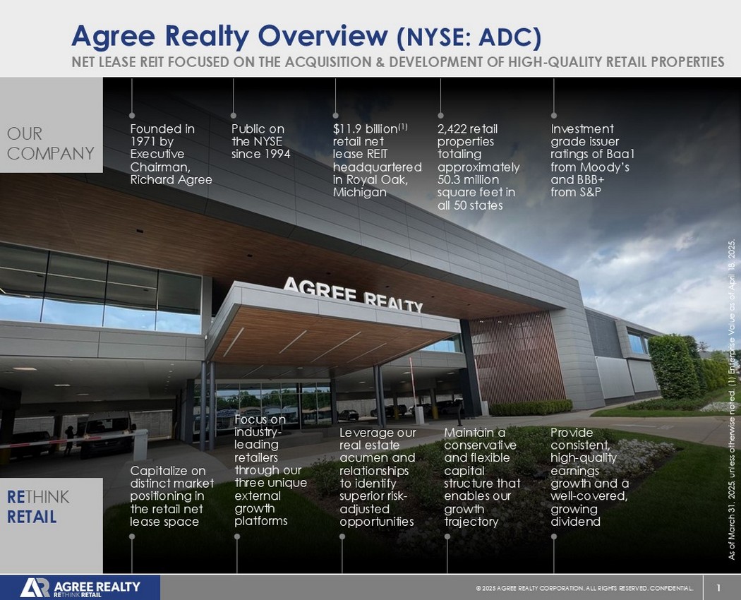 1©2025同意房地产公司。保留所有权利。机密。艾格里不动产概览(纽约证券交易所代码:ADC)我们的公司净租赁REIT专注于收购和开发高质量的零售物业,该公司由执行主席,1971年创立,Richard Agree自1994年以来在纽约证券交易所上市的价值119亿美元(1)零售净租赁REIT总部位于皇家橡树,密歇根州所有50个州的2,422处零售物业,总面积约为5030万平方英尺投资级发行人评级为穆迪的Baa1和标普的BBB + RETHINK RETAIL利用零售净租赁空间中独特的市场定位专注于行业领先的零售商,通过我们三个独特的外部增长平台,利用我们的房地产敏锐度和关系,以识别经风险调整后的优越机会。维持保守和灵活的资本结构,使我们的增长轨迹能够提供持续、高质量的盈利增长以及覆盖良好、不断增长的股息,截至3月3日1,2025年,除非另有说明。(一)截至2025年4月18日的企业价值。