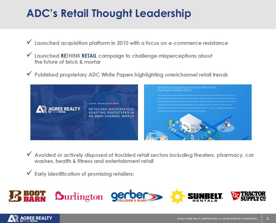 5©2025同意房地产公司。保留所有权利。机密。ADC的零售思想领导力x于2010年推出收购平台,重点关注电子商务阻力x发起RETHINK零售活动,以挑战对实体店未来的误解x发布专有ADC白皮书,突出全渠道零售趋势x避免或积极处置陷入困境的零售行业,包括剧院、药房、洗车、健康和健身以及娱乐零售x及早确定有前景的零售商: