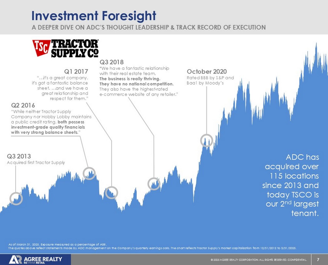 6©2025同意房地产公司。保留所有权利。机密。Omni-渠道愿景确定了净租赁在推动OMNI-渠道战略方面的关键作用“当今全渠道世界中最强大和最具弹性的零售商已经采用了一种全面的方法,该方法模糊了电子商务分销和实体经营之间的历史界限。”-Agree知识库:Omni-Channel 101“E very retailer in the country is going to [ have ] have hundreds of dollars,national retailers,to experiment,to test and eventually effect a true omni-channel experience,because you can't be a e-commerce based retailer or just a bull--based retailer in today,it does not work。”-Joey Agree“所以,我认为,随着零售商们展望2016年及以后,以及他们在全渠道世界中的展望,他们的电子商务存在情况如何,在线下单、实物提货,越来越多的零售商将实现净租赁零售的好处。”-Joey Agree,2016年第一季度财报电话会议“新冠疫情再次证实了我们的信念,第一,我们正朝着一个所有零售商都是全渠道的世界前进。实体店是全渠道整体体验不可或缺的一部分。”-Joey Agree,2022花旗大会