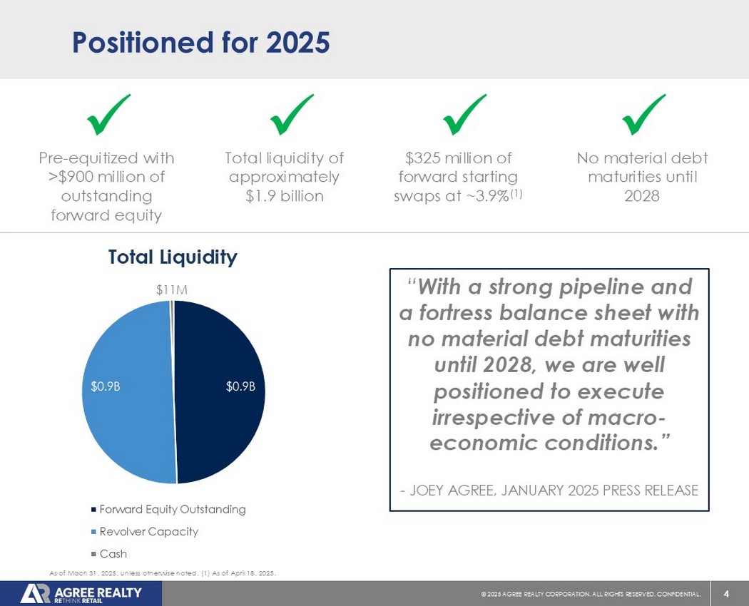 3©2025同意房地产公司。保留所有权利。机密。截至2025年3月31日,除非另有说明。(1)反映公司于2025年4月22日提供的经修订的2025年全年指引。(2)有关公司对投资级别的定义,请参见幻灯片16的脚注1。(3)反映截至2025年3月31日为24个开发和开发者资助平台(“DFP”)项目承诺的资本总额。(4)截至2025年3月31日公司未偿还远期权益结算的备考。(5)公司于2025年4月10日申报。注:本演示文稿包含非GAAP财务指标,这些非GAAP财务指标与最直接可比的GAAP指标的对账包含在附录中。近期亮点2025年第一季度以7.3%的加权平均上限率获得3.59亿美元的高质量零售净租赁资产2025年第一季度获得的基本租金的约68.7%来自投资级零售商(2)Fortress资产负债表,流动性约为19亿美元(4)成立的首个6.25亿美元商业票据计划宣布增加4月份的每月现金股息,为每股普通股0.256美元,同比增长2.4%(5)截至季度末以约1.31亿美元完成或在建的24个开发或DFP项目(3)在2025年第一季度出售了超过240万股远期股权,预计净收益约为1.81亿美元截至3月31日的未偿远期股权超过9.17亿美元将2025年投资指引提高至13亿至15亿美元的高质量零售净租赁资产(1)将2025年较低的每股AFFO指引提高至4.27美元至4.30美元,代表中点增长3.6%(1)截至季度末的3.4倍备考净债务与经常性EBITDA之比(4)