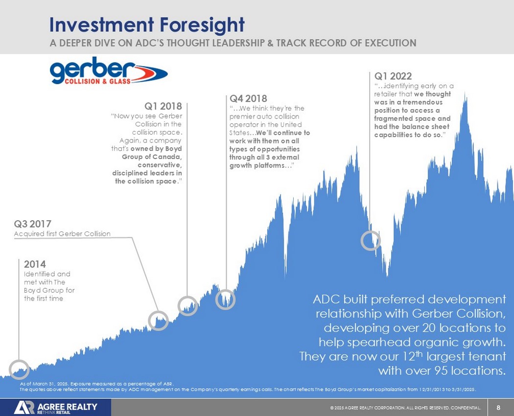 8©2025同意房地产公司。保留所有权利。机密。Investment Foresight A Deeper DIVE on ADC’s Thought Leadership & Track Record of Execution Q3 2017 acquired first Gerber Collision Q4 2018“……我们认为他们是美国首屈一指的汽车碰撞运营商……我们将继续通过所有3个外部增长平台在所有类型的机会上与他们合作……”2022年第一季度“……在一家零售商的早期发现,我们认为它处于进入一个分散空间的巨大位置,并且拥有这样做的资产负债表能力。”ADC与Gerber Collision建立了优选开发关系,开发了20多个地点,以帮助引领有机增长。他们现在是我们的第12大租户,拥有超过95个位置。截至2025年3月31日。以ABR百分比测量的暴露量。上述报价反映了ADC管理层在公司季度财报电话会议上所做的陈述。该图表反映了Boy D Group在12/31/2013至3/31/2025期间的市值。2018年第一季度“现在你可以在碰撞空间看到Gerber Collision。再次,一家由加拿大博伊德集团拥有的公司,在碰撞领域保守、纪律严明的领导者。”2014确定并与博伊德集团首次会晤