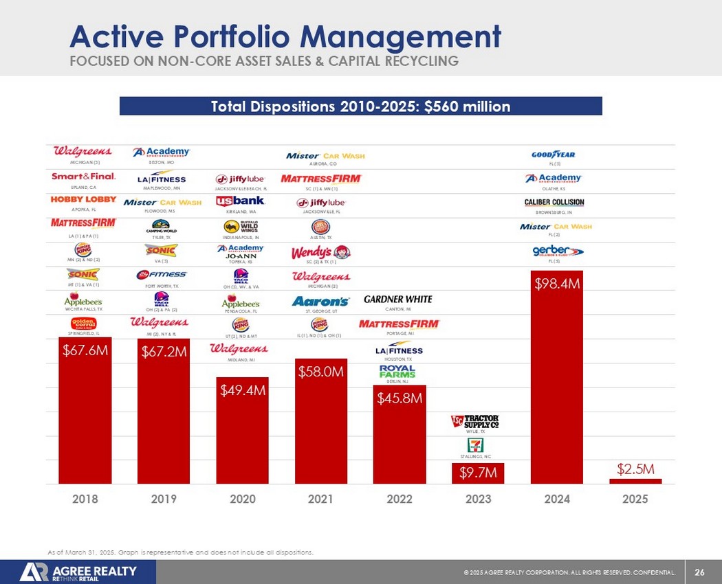25©2025同意房地产公司。保留所有权利。保密。$ 607 $ 701 $ 1.3B $ 1.4B $ 1.6B $ 1.2B $ 867 $ 22 $ 19 $ 27 $ 27 $ 61 $ 55 $ 8402004006008001000120014001600180020002018201920202020202120222023202320242025 ADC自2010年以来已在高质量零售净租赁财产中投资近100亿美元执行发展和DFP(2)收购投资活动记录(百万美元,除非另有说明)截至2025年3月31日,除非另有说明。(1)反映公司于2025年4月22日提供的增加的2025年全年投资指导意见。投资量包括通过公司收购、开发和DFP平台部署的资本。(2)反映期间投入开发和DFP proj EST已建成或在建的资本。$ e(1)$ 1.3b-$ 1.5b