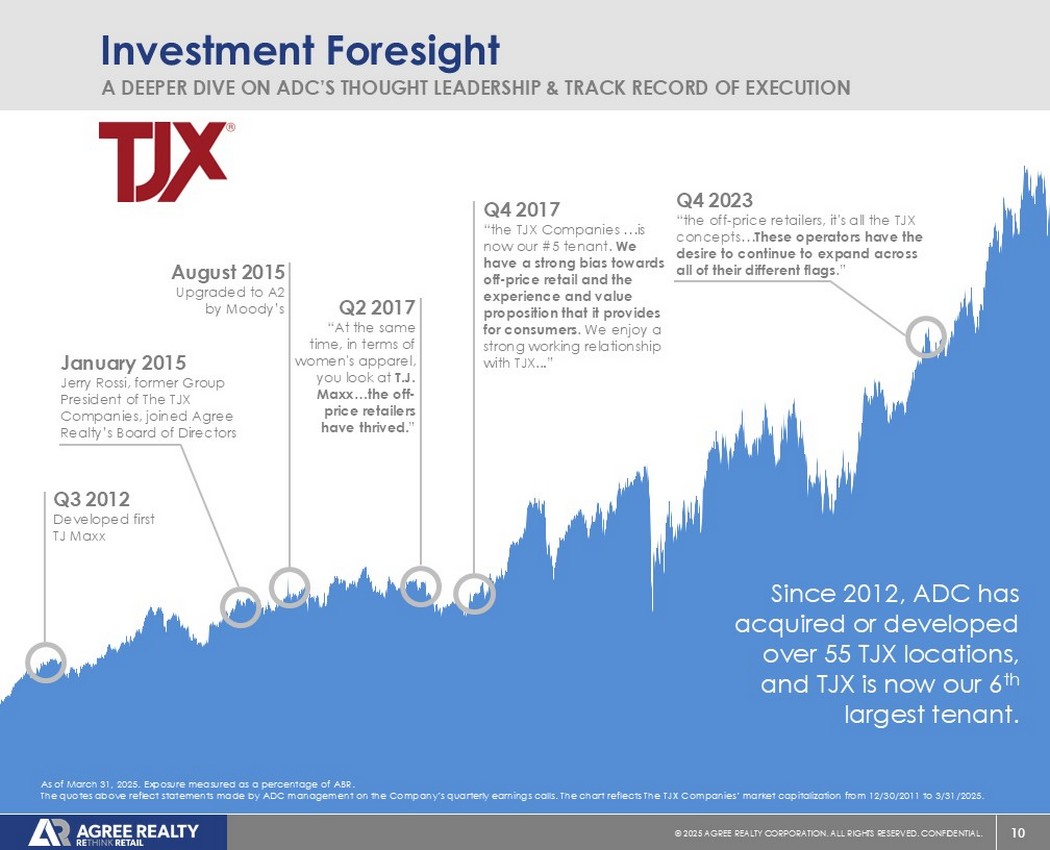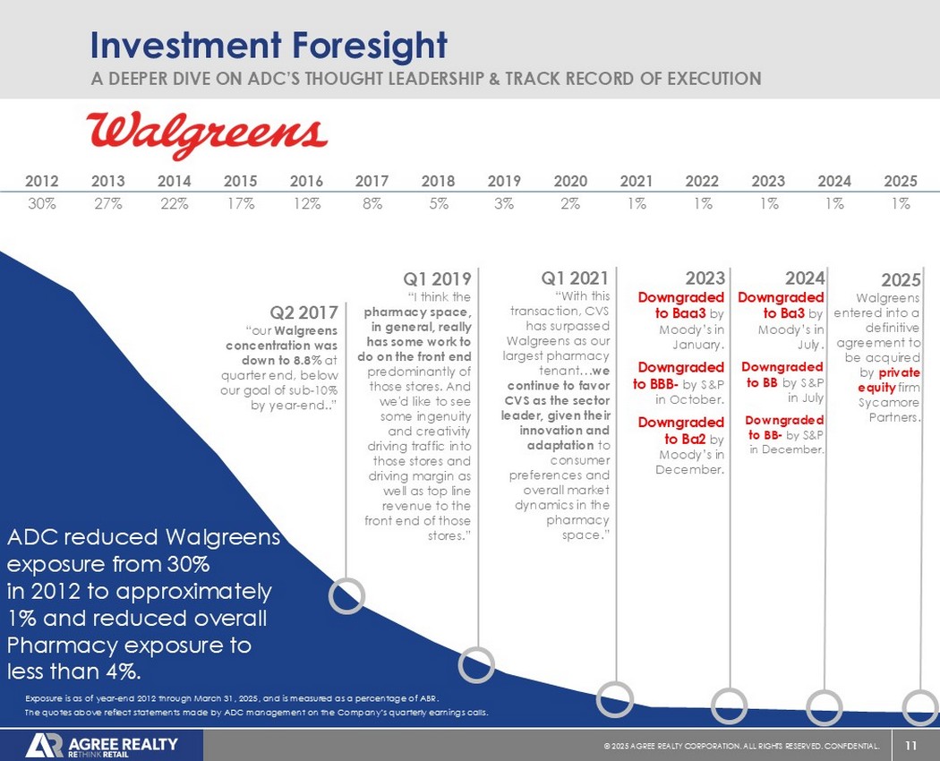 10©2025同意房地产公司。保留所有权利。机密。Investment Foresight A Deeper dive on ADC的思想领导力和执行记录自2012年以来,ADC已经收购或开发了超过55个TJX地点,而TJX现在是我们的第6大租户。截至2025年3月31日。以ABR百分比测量的暴露量。上述报价反映了ADC管理层在公司季度财报电话会议上所做的陈述。图表反映了12/30/2011~3/31/2025期间TJX公司的市值。2012年第3季度开发出首款TJ Maxx 2023年第4季度“平价零售商,都是TJX概念……这些运营商有继续在其所有不同旗帜上扩张的愿望。”2015年8月被穆迪上调至A2评级2017年Q2“与此同时,在女装方面,你看看T.J. Maxx……平价零售商一枝独秀。”2017年第四季度“TJX公司……现在是我们的# 5租户。我们对平价零售以及它为消费者提供的体验和价值主张有着强烈的偏见。我们与TJX享有牢固的工作关系……。”2015年1月TJX公司前集团总裁Jerry Rossi加入艾格里不动产董事会
