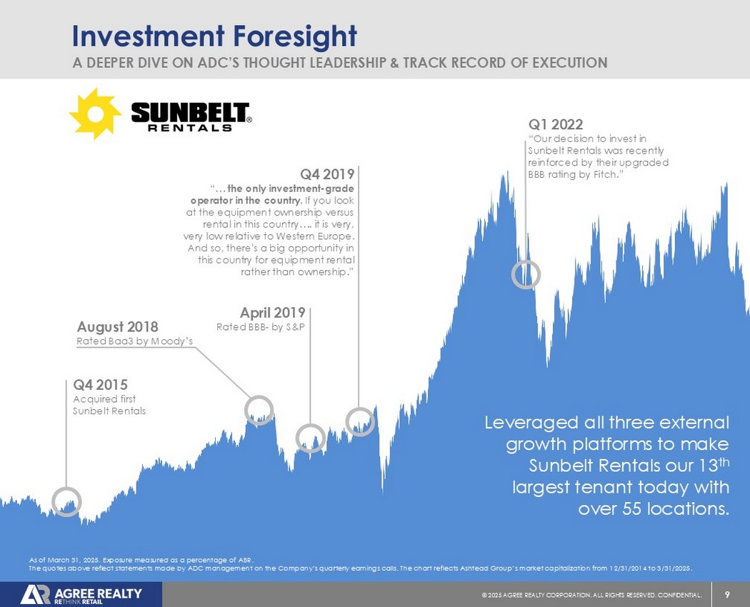 9©2025同意房地产公司。保留所有权利。机密。Investment Foresight A Deeper DIVE on ADC的思想领导力和执行记录利用所有三个外部增长平台,使Sunbelt Rentals成为我们今天拥有超过55个地点的第13大租户。截至2025年3月31日。以ABR百分比测量的暴露量。上述报价反映了ADC管理层在公司季度财报电话会议上的发言。该图表反映了Asht Ead Group在12/31/2014至3/31/2025期间的市值。2015年Q4收购First Sunbelt Rentals 2019年Q4“…全国唯一投资级运营商。如果你看看这个国家的设备拥有量与租金…。相对于西欧来说,这是非常非常低的。因此,在这个国家,设备租赁而不是所有权的机会很大。”2019年4月获标普评级BBB-2018年8月获穆迪2022年第一季度评级Baa3“我们投资Sunbelt Rentals的决定最近得到了惠誉上调的BBB评级的加强。”