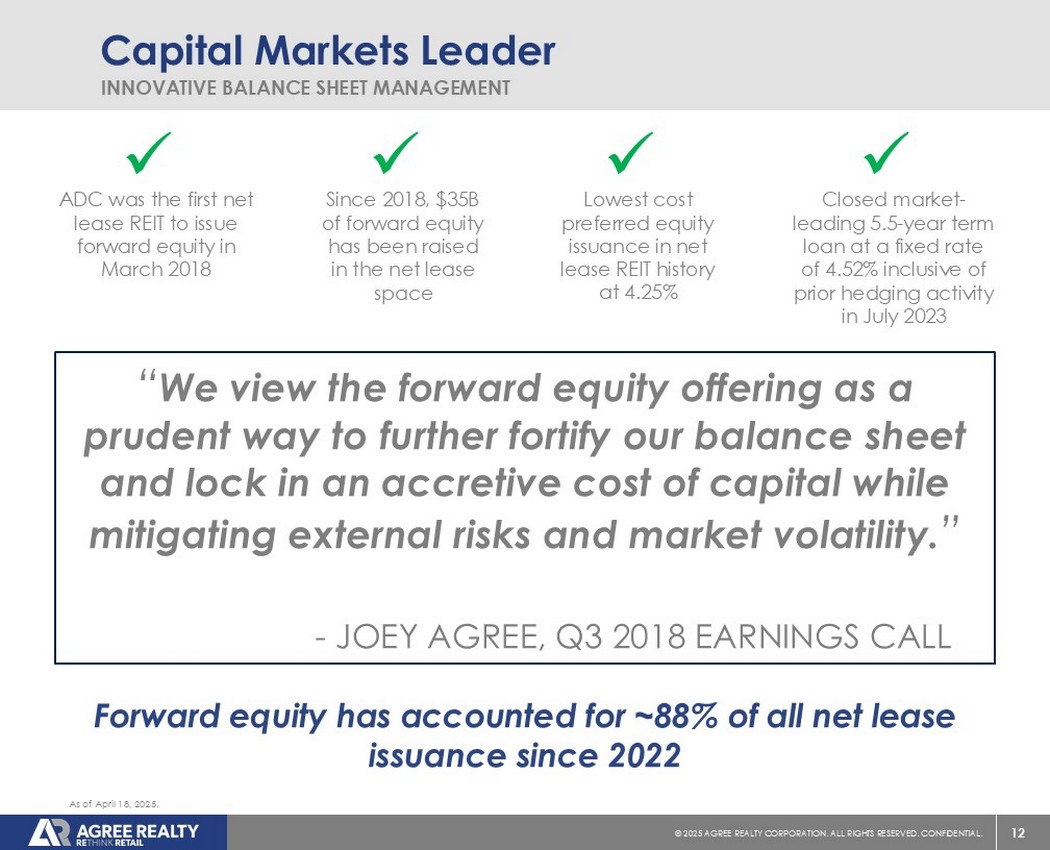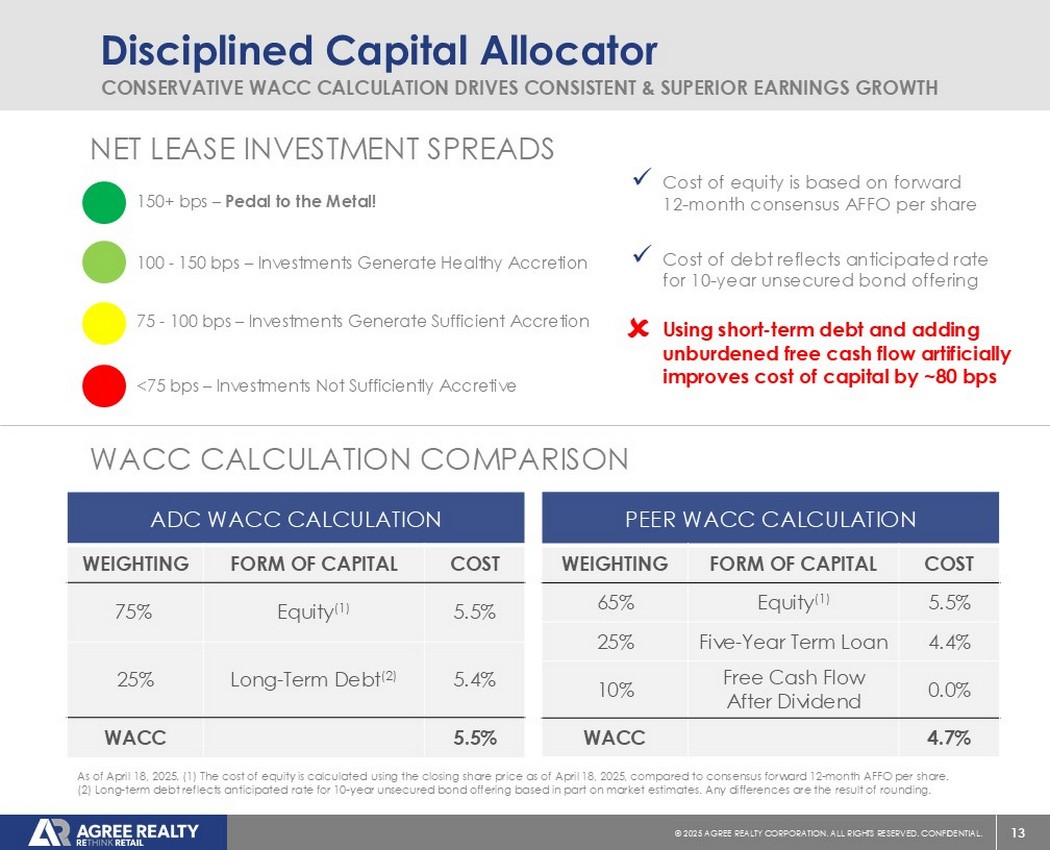 12©2025同意房地产公司。保留所有权利。机密。资本市场领导者Innovative Balance Sheet Management“我们认为,远期股票发行是一种审慎的方式,可以进一步加强我们的资产负债表,锁定资本的增值成本,同时减轻外部风险和市场波动。”-JOEY同意,2018年第三季度收益Call x A ADC是第一个在2018年3月发行远期股权的净租赁REIT x A自2018年以来,在净租赁空间中筹集了35B美元的远期股权x净租赁REIT历史上成本最低的优先股发行,为4.25% x封闭市场-领先的5.5年定期贷款,固定利率为4.52%,包括2023年7月的先前对冲活动,截至2025年4月18日,远期股权占2022年以来所有净租赁发行的约88%。