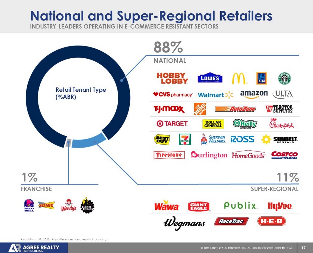 16©2025同意房地产公司。保留所有权利。机密。截至2025年3月31日,资产负债表保守的最佳一流零售商拥有强劲的投资级投资组合16%次级投资等级16%未评级68%投资等级(1)。任何差异都是四舍五入的结果。(1)基于源自租户的ABR,或母实体的reo f,具有标普全球评级、穆迪投资者服务公司、惠誉评级或美国全国保险专员协会的投资级信用评级。零售信贷类型(% ABR)