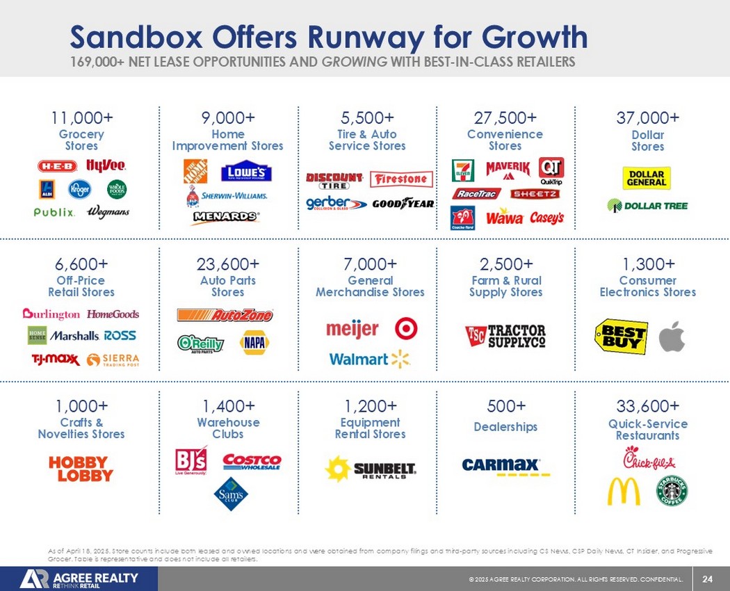 23©2025同意房地产公司。保留所有权利。机密。自上而下关注美国领先零售商与底部成对-向上房地产分析大型和碎片化机会集房地产基础•租金≤市场•建筑市场租金的可替代性•有限竞争•强大的市场存在竞争•准入•能见度•人口统计•主要零售走廊•强大的交通司机零售协同ADC审查了自2018年以来超过920亿美元的机会,截至2025年3月31日,自2018年以来收购了80亿美元。