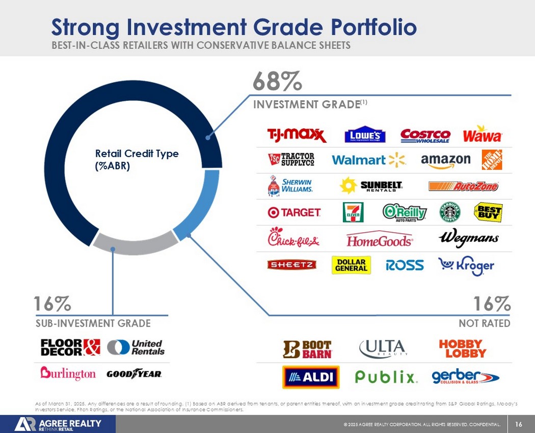 15©2025同意房地产公司。保留所有权利。机密。占年化基本租金租户总数的百分比/概念5.9% $ 38.54.9% 31.8 4.4% 28.4 3.3% 21.7 3.2% 20.5 3.1% 20.0 3.1% 19.9 2.8% 18.3 2.8% 18.3 2.8% 18.2 2.8% 17.9 2.3% 15.2 2.3% 15.0 2.2% 14.2 2.2% 14.0 1.9% 12.4 1.8% 11.4 1.6% 10.4 46.6% 302.6其他100.0% $ 648.7总计648.7占年化基本租金租户部门总数的百分比10.1% $ 65.7杂货店9.1% 59.0家装7.8% 50.5便利店7.8% 50.5轮胎和汽车服务7.0% 45.4美元店6.2% 40.6汽车零部件6.1%33.6农场和农村供应3.9% 25.2消费电子31.6% 204.7其他100.0% 648.7美元总计79.05美元股价(1)87亿美元股权市值(1)(2)2,422处房产计数4.9x/3.4x(3)净债务与EBITDA之比68.3%投资级%(4)公司概况截至2025年3月31日的主要租户(百万美元)主要零售部门(百万美元),除非另有说明。任何差异都是四舍五入的结果。(1)截至2025年4月18日止。(2)反映s c ommon股票和OP流通单位乘以截至2025年4月18日的收盘价。(3)截至2025年3月31日公司未到期远期权益结算的备考。(4)参考幻灯片16上的foot not e 1,公司对投资级别的定义。