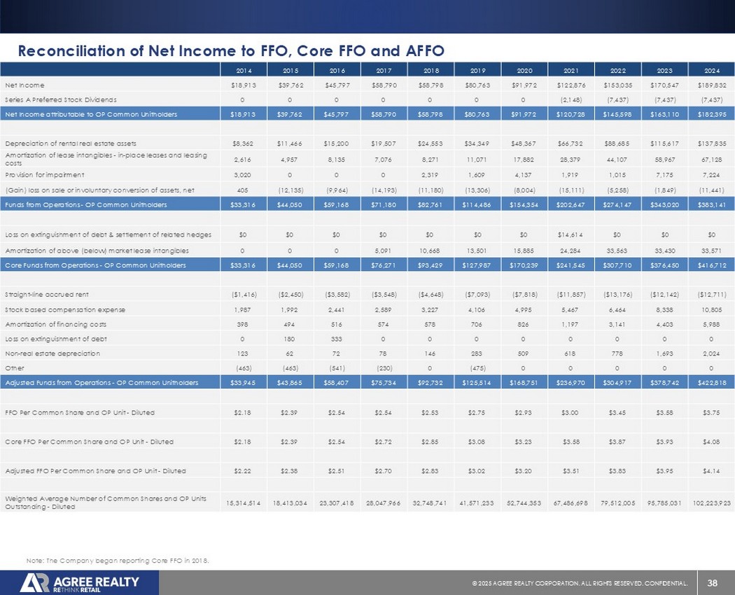 38©2025同意房地产公司。保留所有权利。机密。20242023202220212020201920182017201620152014 $ 189,832 $ 170,547 $ 153,035 $ 122,876 $ 91,972 $ 80,763 $ 58,798 $ 58,790 $ 45,797 $ 39,762 $ 18,913净收益(7,437)(7,437)(7,437)(2,148)0000000 A系列优先股股息$ 182,395 $ 163,110 $ 145,598 $ 120,728 $ 91,972 $ 80,763 $ 58,798 $ 58,790 $ 45,797 $ 39,762 $ 18,913归属于OP普通单位持有人的净利润$ 137,835 $ 115,617 $ 88,685 $ 66,732 $ 48,367 $ 34,349及租赁成本7,2247,1751,0151,9194,1371,6092,3190003,020减值准备(11,441)(1,849)(5,258)(15,111)(8,004)(13,306)(11,180)(14,193)(9,964)(12,135)405(收益)出售或非自愿转换资产的损失,净额383,141美元343,020美元274,147美元202,647美元154,354美元114,486美元82,761美元71,180美元59,168美元44,050美元33,316运营资金-运营共同单位持有人$ 0 $ 0 $ 0 $ 0 $ 0 $ 0 $ 0债务清偿损失和相关对冲结算33,57133,43033,56324,28415,88513,50110,6685,091000以上(以下)市场租赁无形资产摊销416,712美元376,450美元307,710美元241,545美元170,239美元127,987美元93,429美元76,271美元59,168美元44,050美元33,316核心运营资金-运营共同单位持有人(12,711美元)2,5892,4411,9921,987股票补偿费用5,9884,4033,1411,197826706578574516494398融资成本摊销00000000333180000债务清偿损失2,0 241,693778618509283146787262123非房地产折旧0000(475)0(230)(541)(463)(463)其他422,818美元378,742美元304,917美元236,970美元168,751美元125,514美元92,732美元75,734美元58,407美元43,865美元33,945调整后的运营资金-OP普通单位持有人3.75美元3.58美元3.45美元3.00美元2.93美元2.75美元2.53美元2.54美元普通股和OP单位-稀释后$ 4.08 $ 3.93 $ 3.87 $ 3.58 $ 3.23 $ 3.08 $ 2.85 $ 2.72 $ 2.54 $ 2.39 $ 2.18核心FFO每普通股和OP单位-稀释后$ 4.14 $ 3.95 $ 3.83 $ 3.51 $ 3.20 $ 3.02 $ 2.83 $ 2.70 $ 2.51 $ 2.38 $ 2.22调整后的FFO每普通股和OP单位-稀释后102,223,92395,785,03179,512,00567,486,69852,744,35341,571,23332,748,74128,047,96623,307,41818,413,03415,314,514已发行普通股和OP单位加权平均数-稀释后的净收入与FFO、核心FFO和