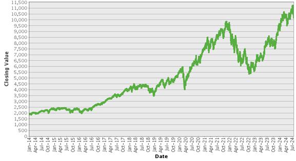 下图显示的是标普 500指数的收盘价®2014年1月2日至2024年7月24日期间,每天都有此类数值的索引。我们从Bloomberg L.P.获得了收盘数值,未经独立验证。你不应该把历史收盘数值作为未来表现的指标。