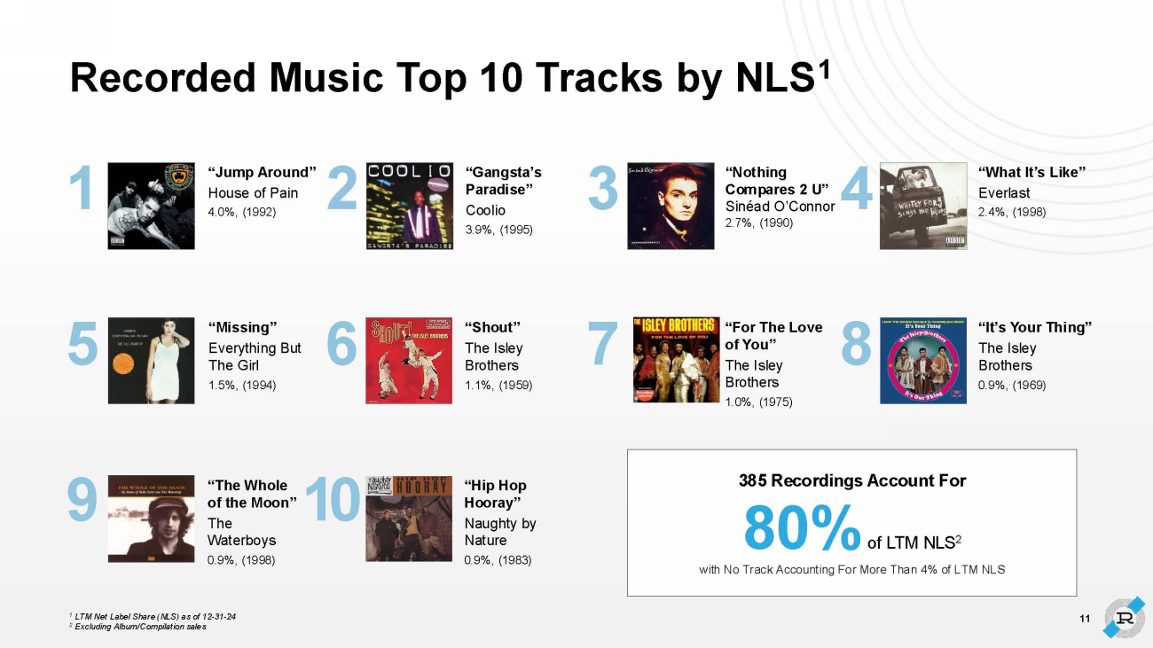 385张唱片占80%的LTM NLS 2无曲目占比超4%的LTM NLS LTM Net Label Shar e(NLS)截至12-31-242不包括专辑/合辑sale的11“Gangsta的天堂”Coolio 3.9%,(1995)12569103748“为了你的爱”The Isley Brothers 1.0%,(1975)“The Whole of the Moon”the Waterboys 0.9%,(1998)“Jump around”the House of Pain 4.0%,(1992)“Missing”everything but the girl 1.5%,(1994)“这是什么样子”Everlast 2.4%,(1998)“Nothing Compares 2 U”Sin é ad O‘Connor 2.7%,(1990)“It’s your thing”The Isley Brothers 0.9%,(1969)“Hip Hop Hooray”Naughty by Nature 0.9%,(1983)“Shout”the Isley Brothers 1.1%,(1959)