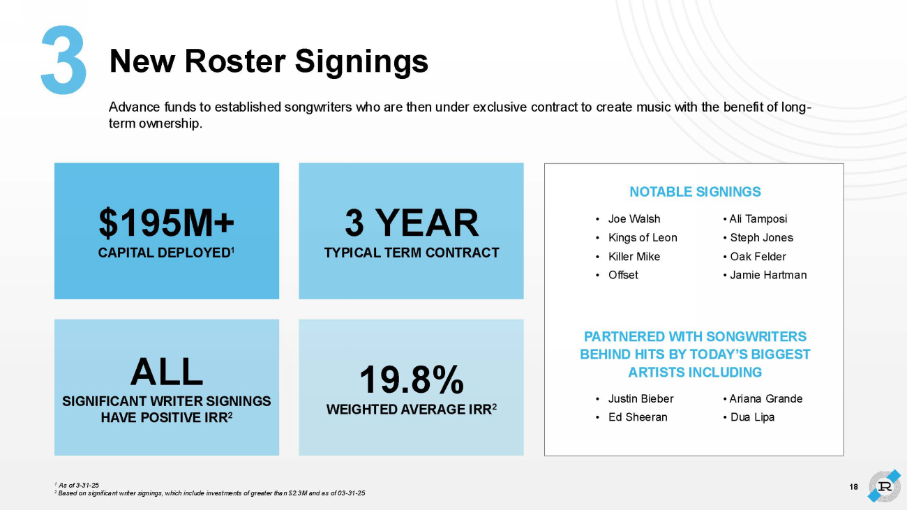 向老牌词曲作者预付资金,这些词曲作者随后获得独家合同,以长期所有权的利益创作音乐。值得注意的签约1.95亿美元+资本部署的13年典型期限合同• Joe Walsh •莱昂国王•杀手麦克•抵消• Ali Tamposi •斯蒂芬琼斯•奥克费尔德•杰米哈特曼所有重要的作家签约都有积极的IRR 2 19.8%加权平均IRR 21截至3-31-252基于重要的NT作家签约,其中包括GR eater的investme nts $ 230 million和截至03-31-25的新名册签约18与当今最大的艺术家背后的歌曲作家合作,包括• 贾斯汀·比伯 • Ed Sheeran • Ariana Grande • Dua Lipa