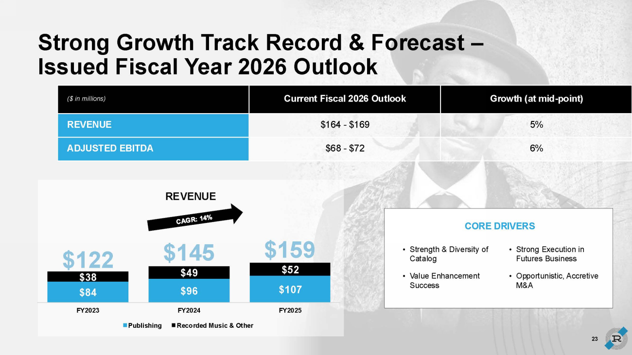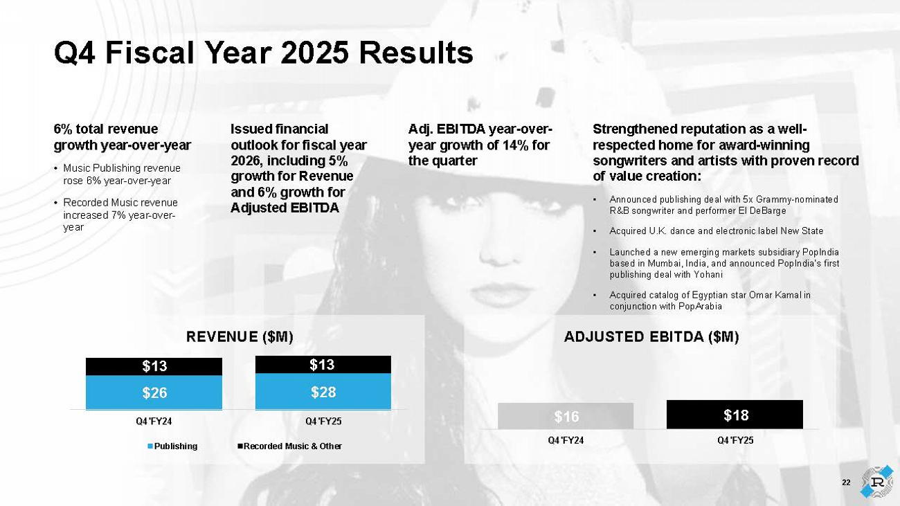 $ 13 $ 26 $ 13 $ 28 Q4‘FY24 Q4’FY25出版录制音乐及其他收入($ M)$ 16 Q4‘FY24 $ 18 Q4’FY25调整后EBITDA($ M)Q4 FY2025业绩总收入同比增长6% •音乐出版收入同比增长6% •录制音乐收入同比增长7%已发布的2026财年财务展望,包括收入增长5%和调整后EBITDA增长6%增强了作为屡获殊荣的词曲作者和艺术家的备受尊重的家园的声誉,这些词曲作者和艺术家拥有可靠的价值创造记录:•宣布与5x格莱美提名的R & B词曲作者和表演者El DeBarge达成出版协议•收购英国舞蹈和电子标签New State •在印度孟买推出新的新兴市场子公司PopIndia,并宣布PopIndia与Yohani达成首份出版协议•与PopArabia Adj联合收购埃及明星Omar Kamal的目录。本季度EBITDA同比增长14% 22