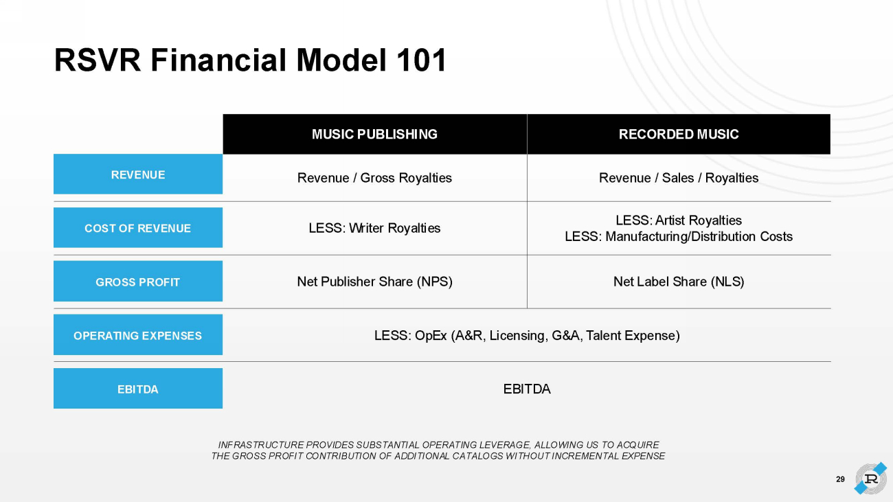 RSVR财务模型101基础设施提供了可观的运营杠杆,使我们能够在不增加额外费用的情况下获得额外目录的毛利润贡献29减:运营支出(A & R、许可、G & A、人才费用)EBITDA记录的音乐出版收入/销售额/版税收入/总版税收入减:艺术家版税减:制造/发行成本减:作家版税收入成本净标签份额(NLS