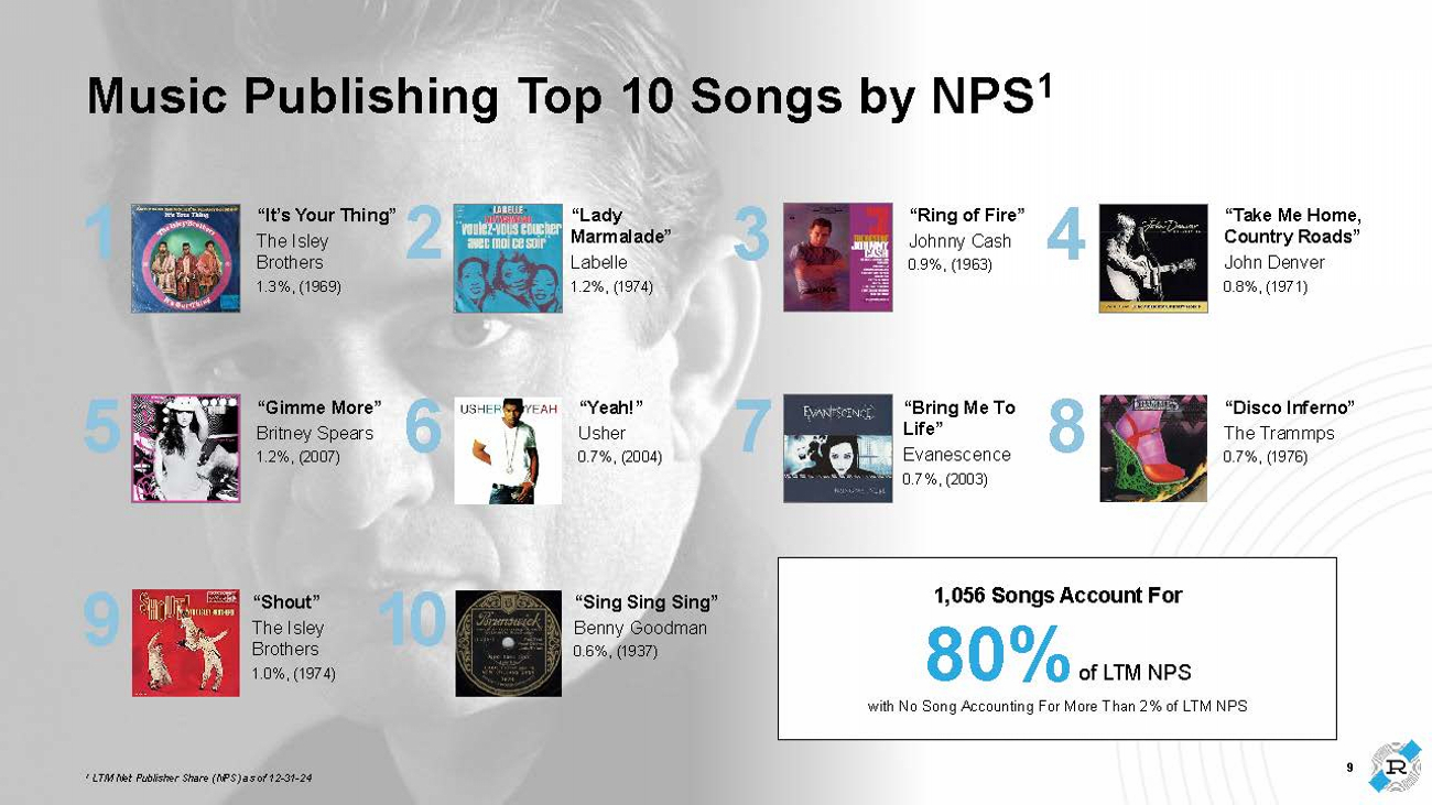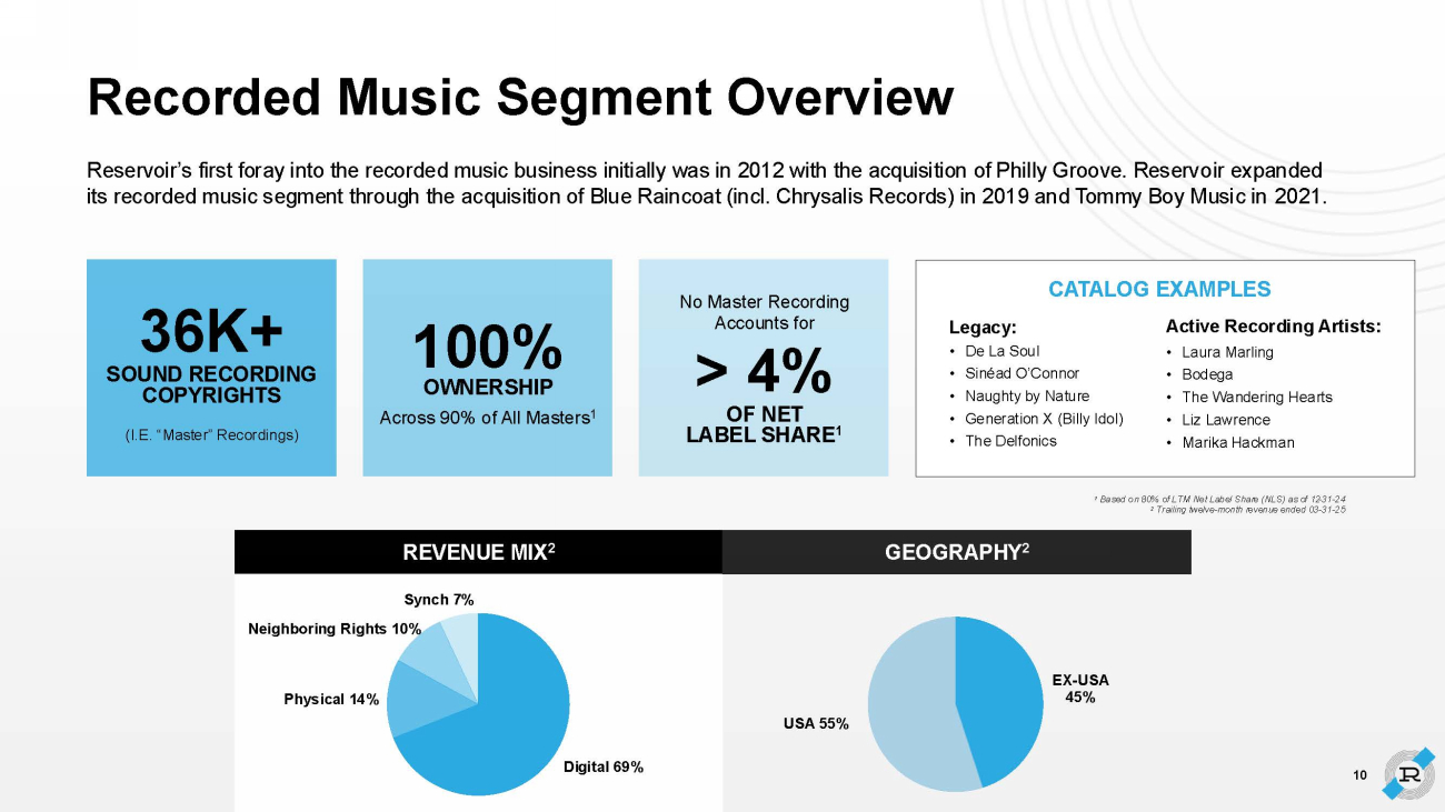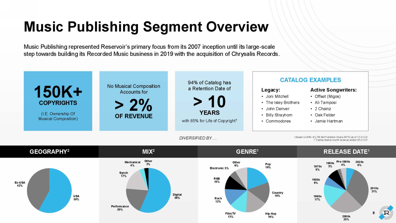 Digital 56% Perform ance 20% Synch 17% Mechanic al 4% Other 3% Legacy:Active Songwriters:• Joni Mitchell • Offset(MIGOS)• The Isley Brothers • Ali Tamposi • John Denver • 2 Chainz • Billy Strayhorn • Oak Felder • Commodores • Jamie Hartman CATALOG examples no musical composition accounts for > 2% of revenue 94% of Catalog has a retention date of > 10 years with 85% for life of Copyright 1 USA 58% ex-USA 42% diversified by…。202年代6% 2010年代31% 200年代25% 199年代17% 198年代6% 197年代8% 3% 196年代前-196年代4%流行音乐19%乡村16%嘻哈音乐16%电影/电视13%摇滚12% R & B 10%电子5%其他9% 1基于80%的LTM净发行商份额(NPS)截至12-31-242过去12个月的收入截至03-31-25地理2 MIX 2 GENRE 1发布日期1 150k +版权(即音乐作品所有权)音乐出版部门概览音乐出版是Reservoir从2007年开始的主要关注点,直到2019年通过收购Chrysalis Records向建立其唱片音乐业务迈出了大规模的一步。8