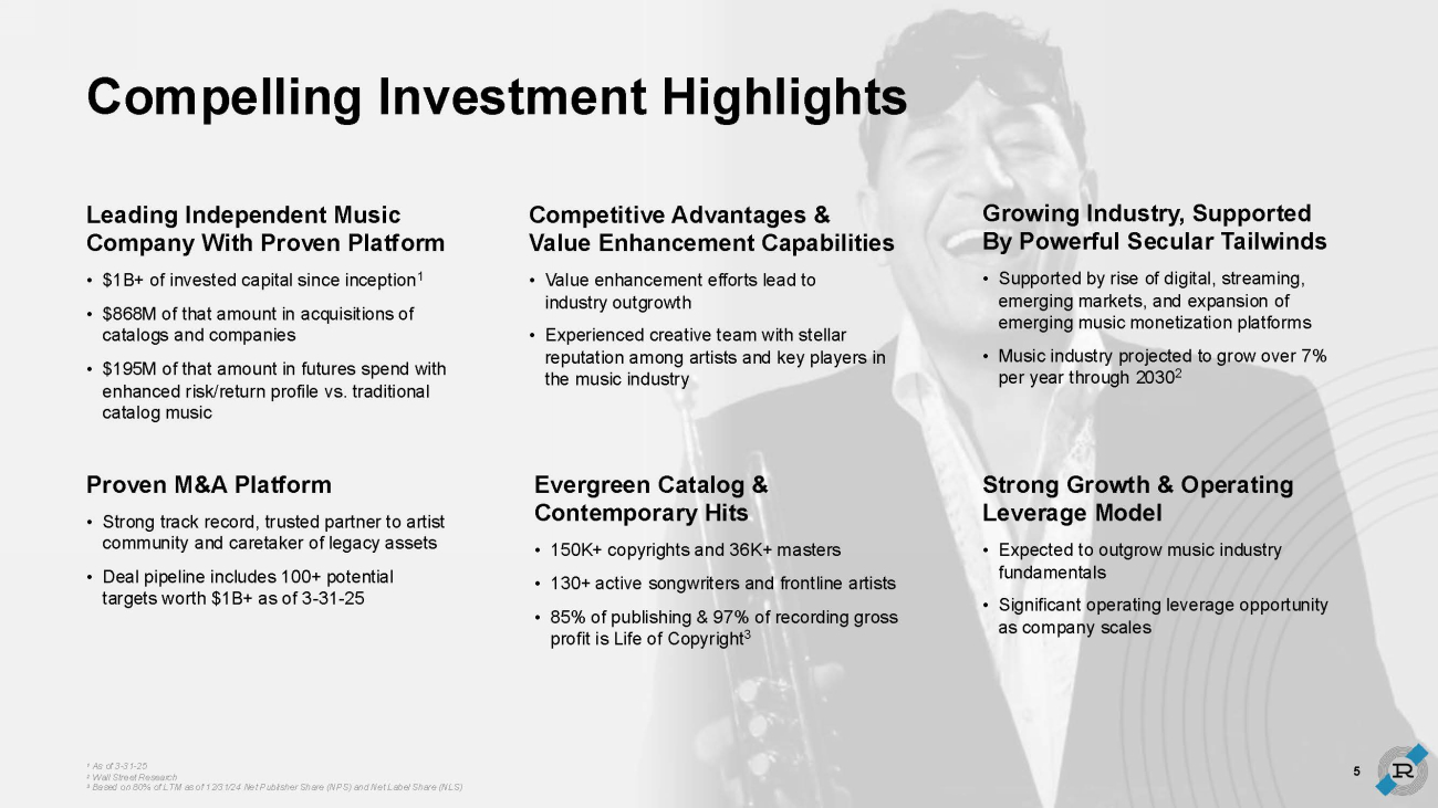 1截至3日-31-252华尔街研究3基于截至24/12/31的80%的LTM净发行商份额(NPS)和净标签份额(NLS)引人注目的投资亮点领先的独立音乐公司,拥有经过验证的平台•自成立以来的投资资本为10亿美元+ 1 •其中8.68亿美元用于收购目录和公司• 1.95亿美元与传统目录音乐Evergreen Catalog & Contemporary Hits相比,风险/回报状况增强的期货支出金额• 150K +版权和36K +大师• 130 +活跃的词曲作者和一线艺术家•85%的出版和97%的记录毛利润是版权的生命3经过验证的并购平台•强劲的业绩记录,艺术家社区值得信赖的合作伙伴和遗留资产的照顾者•交易管道包括100多个潜在目标,截至3-31-25年,价值$ 1B +强劲增长和运营杠杆模型•预计将超过音乐行业基本面•随着公司扩大增长行业,在强大的长期顺风的支持下,运营杠杆机会显着•受数字、流媒体、新兴市场崛起的支持,和扩大新兴音乐变现平台•音乐行业预计到2030年每年增长超过7% 2竞争优势和价值提升能力•价值提升努力导致行业结果•经验丰富的创意团队,在艺术家和音乐行业关键参与者中享有极高的声誉5
