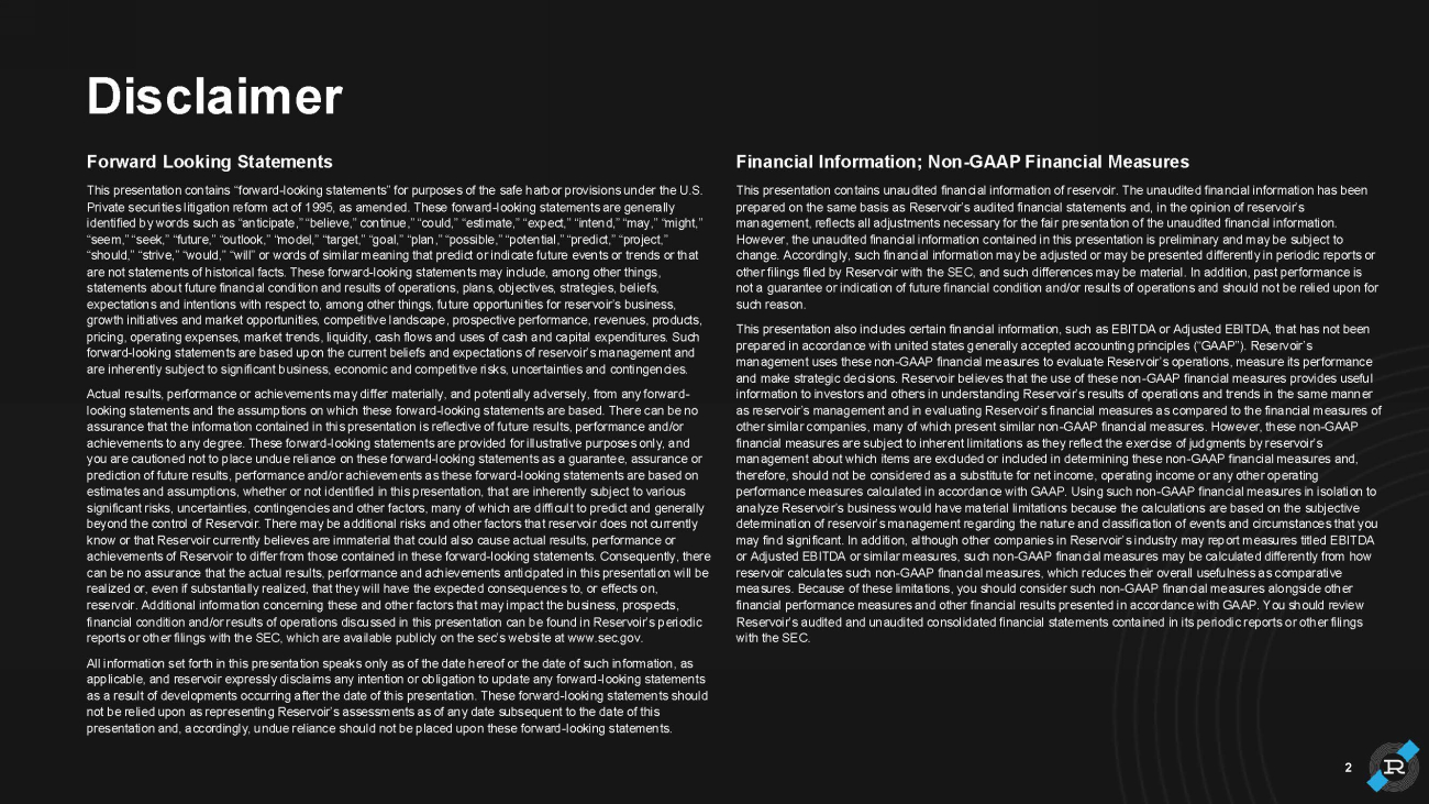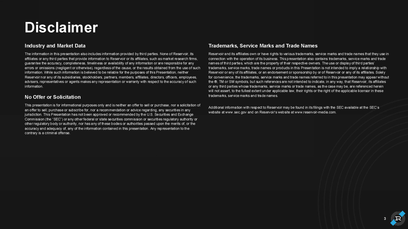 前瞻性陈述本演示文稿包含“前瞻性陈述”,用于1995年经修订的美国私人证券诉讼改革法案下的安全港条款。这些前瞻性陈述一般由“预期”、“相信”、“继续”、“可能”、“估计”、“预期”、“打算”、“可能”、“可能”、“似乎”、“寻求”、“未来”、“展望”、“模型”、“目标”、“目标”、“计划”、“可能”、“潜力”、“预测”、“项目”、“应该”、“努力”、“将”、“将”等词语识别,或预测或指示未来事件或趋势或不是历史事实陈述的类似含义的词语。除其他外,这些前瞻性陈述可能包括关于未来财务状况和经营成果、计划、目标、战略、信念、期望和意图的陈述,其中包括水库业务的未来机会、增长举措和市场机会、竞争格局、预期业绩、收入、产品、定价、运营费用、市场趋势、流动性、现金流以及现金和资本支出的使用。此类前瞻性陈述基于水库管理层当前的信念和期望,并固有地受到重大商业、经济和竞争风险、不确定性和意外情况的影响。实际结果、业绩或成就可能与任何前瞻性陈述和这些前瞻性陈述所依据的假设存在重大差异,并可能产生不利影响。无法保证本演示文稿中包含的信息在任何程度上都反映了未来的成果、业绩和/或成就。提供这些前瞻性陈述仅用于说明目的,请注意不要过分依赖这些前瞻性陈述作为对未来结果、业绩和/或成就的保证、保证或预测,因为这些前瞻性陈述基于估计和假设,无论是否在本演示文稿中确定,这些估计和假设固有地受到各种重大风险、不确定性、意外事件和其他因素的影响,其中许多因素很难预测,而且通常超出了Reservoir的控制范围。可能存在水库目前不知道或水库目前认为无关紧要的额外风险和其他因素,这些因素也可能导致水库的实际结果、业绩或成就与这些前瞻性陈述中包含的内容不同。因此,无法保证本演示文稿中预期的实际结果、业绩和成就将会实现,或者即使已基本实现,也无法保证它们将对水库产生预期的后果或影响。有关本演示文稿中讨论的可能影响业务、前景、财务状况和/或经营业绩的这些和其他因素的更多信息,可在Reservoir向SEC提交的定期报告或其他文件中找到,这些文件可在SEC网站www.sec.gov上公开查阅。本演示文稿中列出的所有信息仅在本演示文稿发布之日或此类信息发布之日(如适用)发表,并且Reserco明确表示不打算或有义务因本演示文稿发布之日之后发生的事态发展而更新任何前瞻性陈述。这些前瞻性陈述不应被视为代表Reservoir在本陈述日期之后的任何日期的评估,因此,不应过分依赖这些前瞻性陈述。财务信息;非GAAP财务指标本演示文稿包含未经审计的水库财务信息。未经审计的财务信息是根据与水库经审计的财务报表相同的基础编制的,水库管理层认为,这些信息反映了为公平列报未经审计的财务信息而进行的所有必要调整。然而,此列报中所载未经审计的财务信息是初步的,可能会发生变化。因此,这些财务信息可能会被调整,或者可能会在Reservoir向SEC提交的定期报告或其他文件中以不同的方式呈现,这种差异可能是重大的。此外,过去的业绩不是对未来财务状况和/或经营业绩的保证或指示,因此不应被依赖。该演示文稿还包括某些财务信息,例如未按照美国公认会计原则(“GAAP”)编制的EBITDA或调整后EBITDA。Reservoir的管理层使用这些非GAAP财务指标来评估Reservoir的运营, 衡量其绩效并做出战略决策。Reservoir认为,这些非GAAP财务指标的使用为投资者和其他人提供了有用的信息,有助于他们以与Reservoir管理相同的方式了解Reservoir的运营结果和趋势,并与其他类似公司的财务指标相比评估Reservoir的财务指标,其中许多公司提供了类似的非GAAP财务指标。然而,这些非GAAP财务指标受到固有的限制,因为它们反映了Reservoir管理层对确定这些非GAAP财务指标时排除或包括哪些项目的判断,因此不应被视为替代根据GAAP计算的净收入、营业收入或任何其他经营业绩指标。孤立地使用这种非GAAP财务指标来分析Reservoir的业务会有重大限制,因为计算是基于Reservoir管理层对您可能发现的重大事件和情况的性质和分类的主观确定。此外,尽管Reservoir行业中的其他公司可能会报告标题为EBITDA或调整后EBITDA或类似措施的措施,但此类非GAAP财务措施的计算方式可能与Reservoir计算此类非GAAP财务措施的方式不同,这降低了它们作为比较措施的整体有用性。由于这些限制,您应该将这类非GAAP财务指标与其他财务业绩指标和其他根据GAAP呈现的财务结果一起考虑。您应该查看Reservoir定期报告或提交给SEC的其他文件中包含的经审计和未经审计的合并财务报表。免责声明2