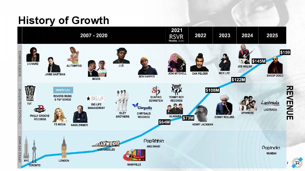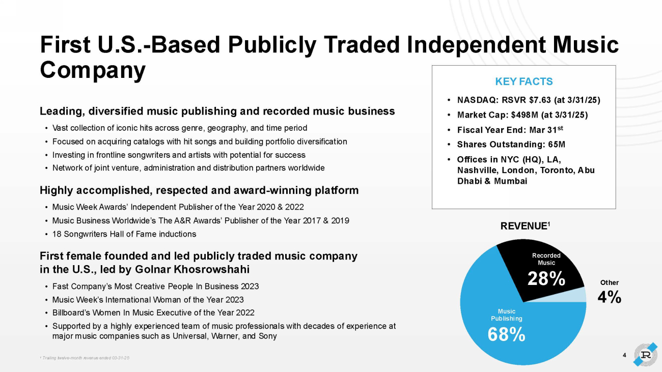 首家美国上市独立音乐公司关键事实•纳斯达克:RSVR 7.63美元(截至3/31/25)•市值:4.98亿美元(截至3/31/25)•财政年度终了:3月31日•在纽约市(总部)、洛杉矶、纳什维尔、伦敦、多伦多、阿布扎比和孟买设有办事处4个领先的、多元化的音乐出版和录制音乐业务•广泛收集跨越流派、地理和时间段的标志性热门歌曲•专注于收购具有热门歌曲的目录并建立组合多样化•投资于具有成功潜力的一线词曲作者和艺术家•合资公司网络,全球范围内的管理和发行合作伙伴成就卓著、受人尊敬且屡获殊荣的平台• Music Week Awards的2020 & 2022年度独立发行商• Music Business Worldwide的A & R Awards的2017 & 2019年度发行商• 18位词曲作者Hall of Fame入选美国首位女性创立并领导上市音乐公司,由Golnar Khosrowshahi领衔• Fast Company 2023年度最具创造力商业人士•音乐周2023年度国际女性•公告牌2022年度音乐女性高管•由经验丰富的音乐专业人士团队提供支持,他们在环球、华纳、索尼等主要音乐公司拥有数十年的经验收入11过去12个月的收入结束03-31-25音乐出版68%记录音乐28%其他4%