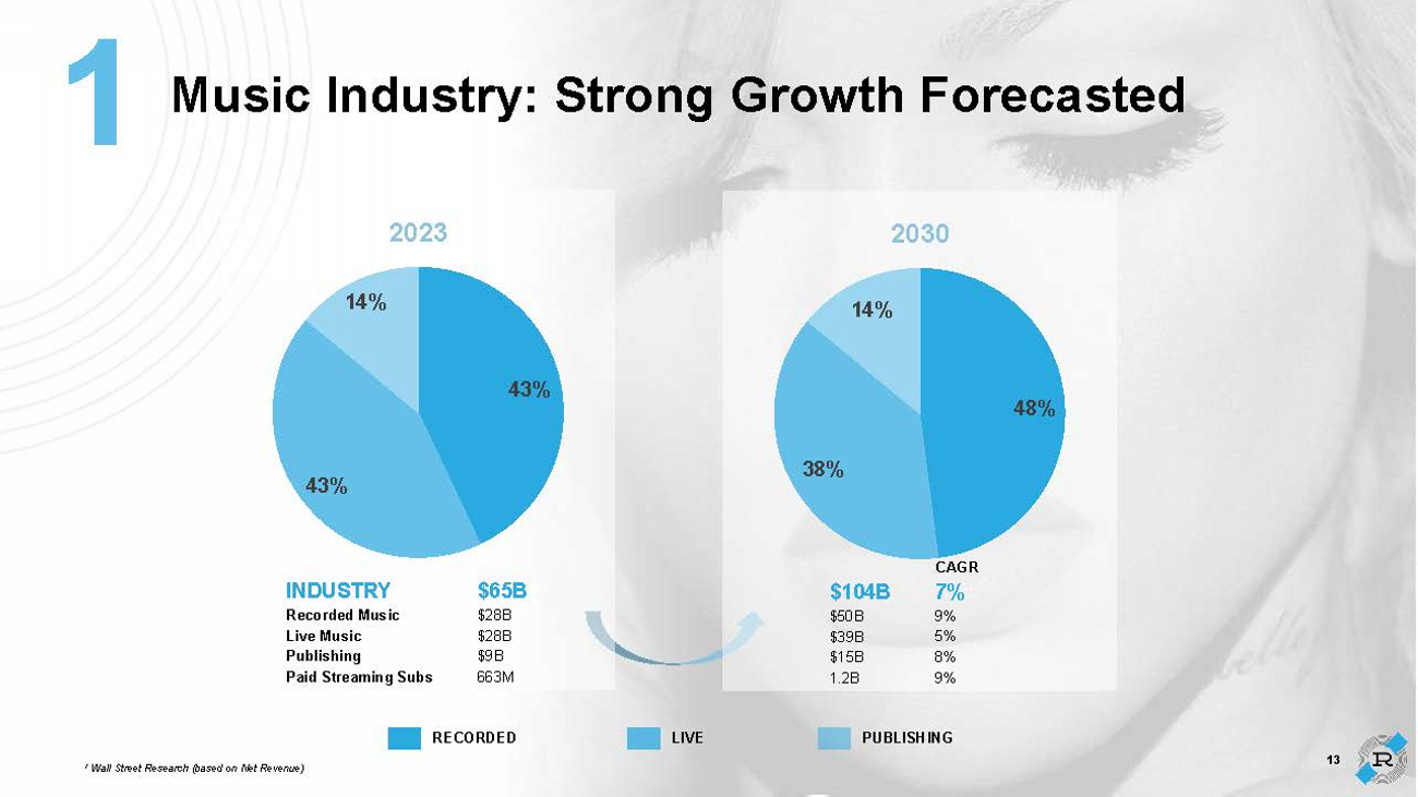 1华尔街研究(基于净收入)音乐行业:强劲增长预测记录的现场出版13行业记录的音乐现场音乐出版付费流媒体订阅$ 65B $ 28B $ 28B $ 9B 663M 202343% 43% 14% $ 104B $ 50B $ 39B $ 15B 1.2B CAGR 7% 9% 5% 8% 9% 203048% 38% 14%