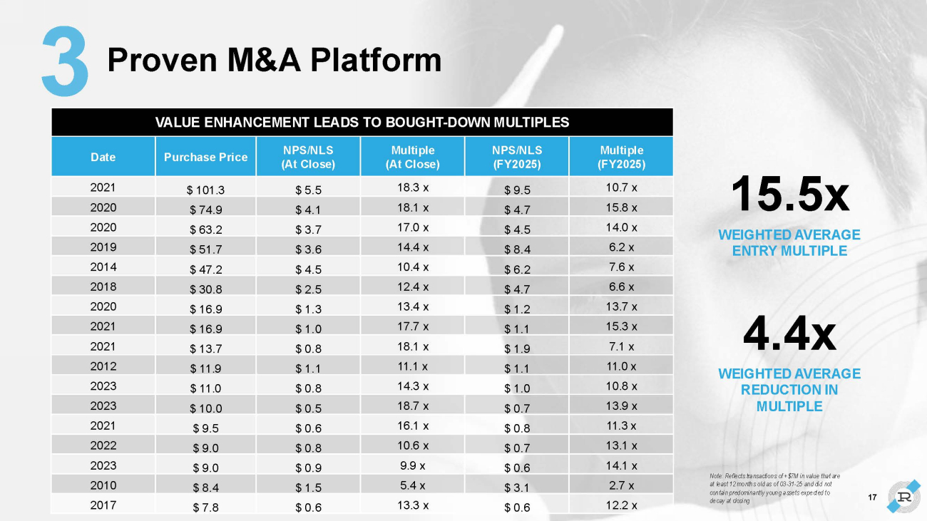 注:反映价值+ 700万美元的交易截至03-31-25日至少12个月大的且不包含主要是年轻资产预计在收盘时衰减经验证的并购平台15.5倍加权平均入口倍数4.4倍加权平均降值倍数增值导致买入-卖出倍数(FY2025)NPS/NLS(FY2025)倍数(收盘时)TERM0NPS/NLS(收盘时)购买价格日期10.7 x $ 9.5 18.3 x $ 5.5 $ 101.3202115.8 x $ 4.7 18.1 x $ 4.1 $ 74.9 202014.0 x $ 4.517.0 x $ 3.7 $ 63.220206.2 x $ 8.4 14.4 x $ 3.647.2 20146.6 x $ 4.71 2.4x $ 2.5 $ 30.8 201813.7 x $ 1.21 3.4x $ 1.3 $ 16.9 202015.3 x $ 1.117.7 x $ 1.0 $ 16.9 20217.1 x $ 1.9 18.1 x $ 0.8 $ 13.7 20211.0 x $ 1.11 1.1 x $ 1.1 $ 11.9 201210.8 x $ 1.01 4.3x $ 0.8 $ 11.0 202313.9 x $ 0.7 18.7 x $ 0.5 $ 10.0202311.3 x $ 0.8 16.1 x $ 0.6 $ 9.5 202113.1 x $ 0.7 10.6 x $ 0.8 $9.0202214.1 x $ 0.69.9 x $ 0.9 $ 9.020232.7 x $ 3.15.4 x $ 1.5 $ 8.4 201012.2 x $ 0.61 3.3 x $ 0.6 $ 7.8 201717