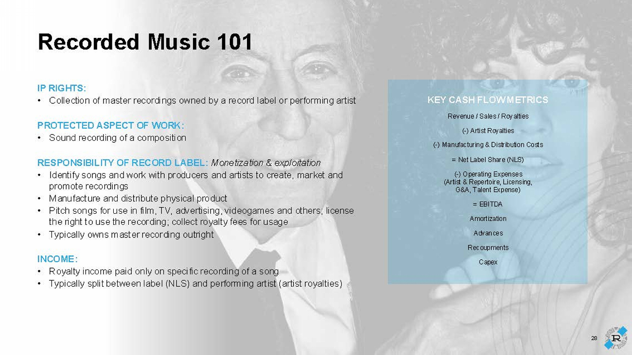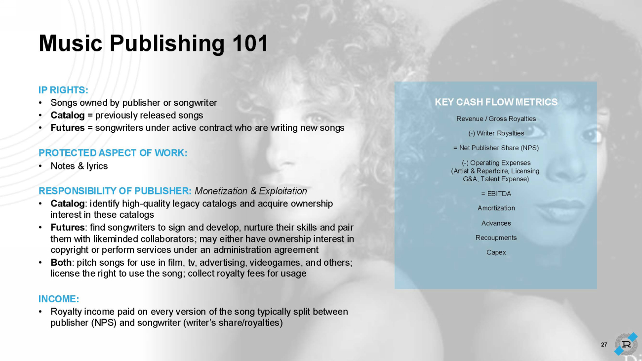 音乐出版101 IP权利:•出版商或词曲作者拥有的歌曲• Catalog =以前发行的歌曲• Future =正在创作新歌的活跃合同中的词曲作者受保护的工作方面:• Publisher的笔记和歌词责任:货币化和开发• Catalog:确定高质量的遗产目录并获得这些目录的所有权权益• Future:找到词曲作者签约和开发,培养他们的技能,并将他们与志同道合的合作者配对;可能对版权拥有所有权权益,或者根据管理协议提供服务•两者兼而有之:为电影、电视、广告、电子游戏等使用而推销歌曲;许可歌曲的使用权;收取使用收入的版税费用:•为歌曲的每个版本支付的版税收入通常由出版商(NPS)和词曲作者(作家分成/版税)主要现金流指标收入/总版税(-)作家版税=净出版商份额(NPS)(-)运营费用(艺术家和曲目、许可,G & A,人才费)= EBITDA摊销预付款回收资本支出27