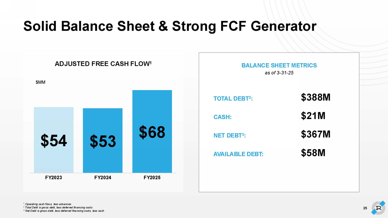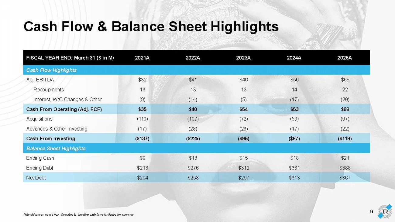 2025A 2024A 2023A 2022A 2021A财年末:3月31日(百万美元)现金流亮点$ 66 $ 56 $ 46 $ 41 $ 32 Adj. EBITDA 2214131313回收(20)(17)(5)(14)(9)利息,W/C Changes & Other $ 68 $ 53 $ 54 $ 40 $ 35 Cash from Operating(Adj. FCF)(97)(50)(72)(197)(119)Acquisitions(22)(17)(23)(28)(17)Advances & Other Investing($ 119)($ 67)($ 95)($ 225)($ 137)Cash from Investing balance sheet highlights $ 21 $ 18 $ 15 $ 18 $ 9 Ending cash $ 388 $ 331 $ 312 $ 276 $ 213 Ending ding debt $ 367 $ 313 $ 297 $ 258 $ 204 Net debt note:advances moved from Oper atin g to inve sting cash flow for illustr