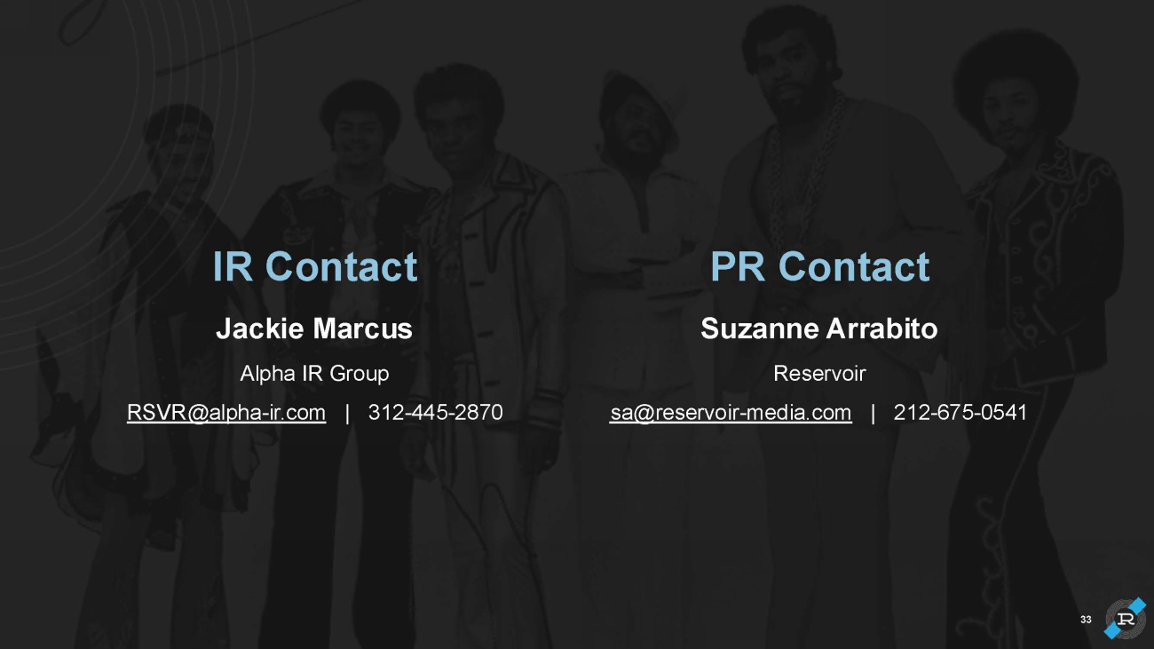 PR联系人Suzanne Arrabito Reservoir sa@reservoir-media.com | 212-675-0541 33 IR联系人Jackie Marcus Alpha IR Group RSVR@alpha-ir.com | 312-445-2870