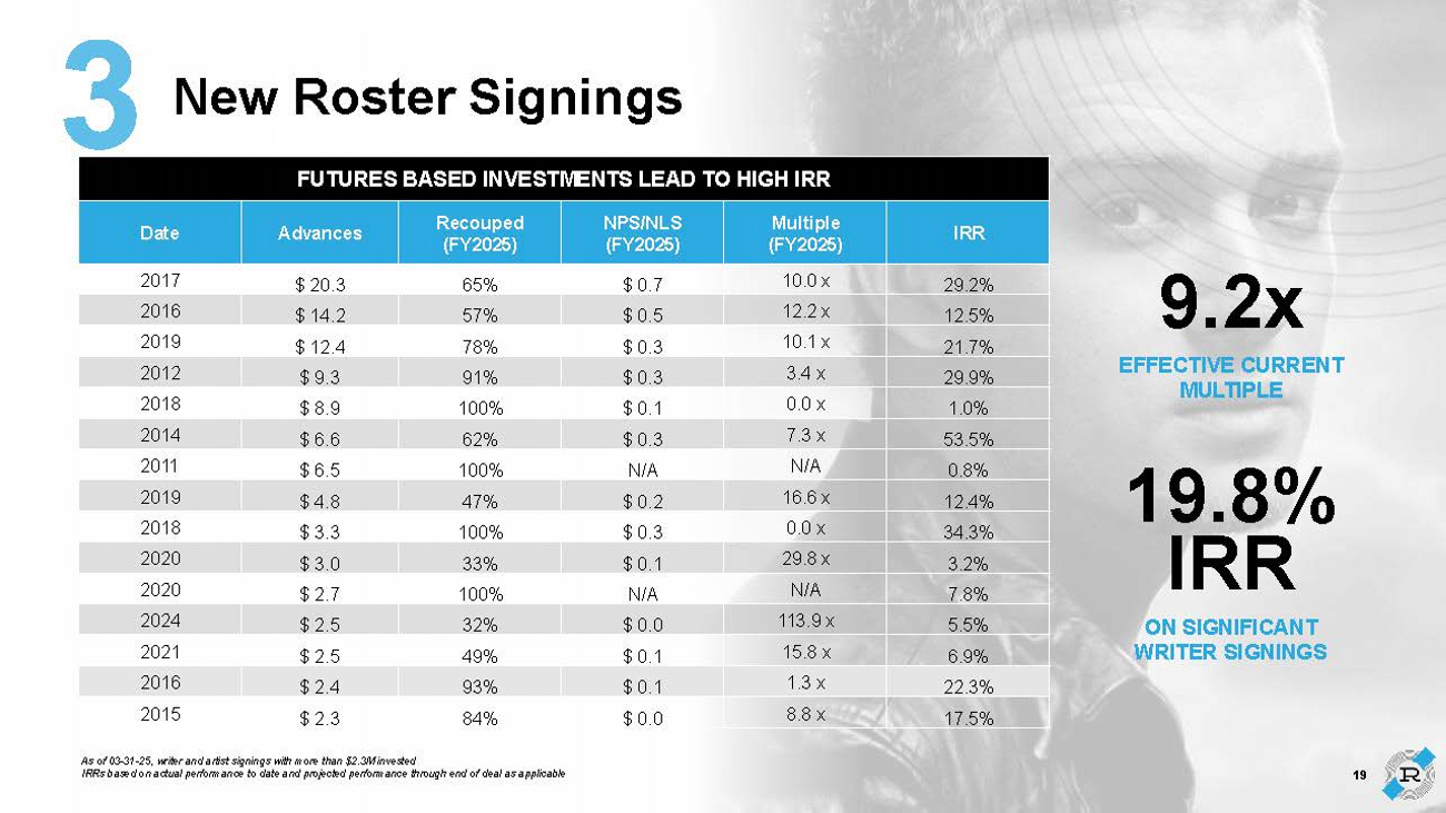 基于期货的投资导致较高的IRR IRR倍数(FY2025)NPS/NLS(FY2025)收回(FY2025)预付款日期29.2% 10.0 x $ 0.765% $ 20.3 201712.5% 12.2 x $ 0.557% $ 14.2 201621.7% 10.1 x $ 0.378% $ 12.4 201929.9% 3.4 x $ 0.391% $ 9.3 20121.0% 0.0 x $ 0.1 100% $ 8.9 201853.5% 7.3 x $ 0.362% $ 6.6 20140.8% N/A N/A 100% $ 6.5 201112.4% 16.6 x $ 0.247% $ 4.8 201934.3% 0.0 x $ 0.3 100% $ 3.320183.2% 29.8 x $ 0.133% $ 3.020207.8% N/A N/A 100% $ 2.7 20205.5% 113.9 x $ 0.032% $ 2.520246.9% 15.8 x $ 0.149% $ 2.5202122.3% 1.3 x $ 0.193% $ 2.4201617.5% 8.8 x $ 0.084% $ 2.32015截至03-31-25,作家和艺术家以超过230万美元的投资IRR b ase d on actual performance ce to date a nd projected performance th rough end of deal as a plicable new roster signings 9.2x effective current multiple 19.8% IRR on significant writer signings 19