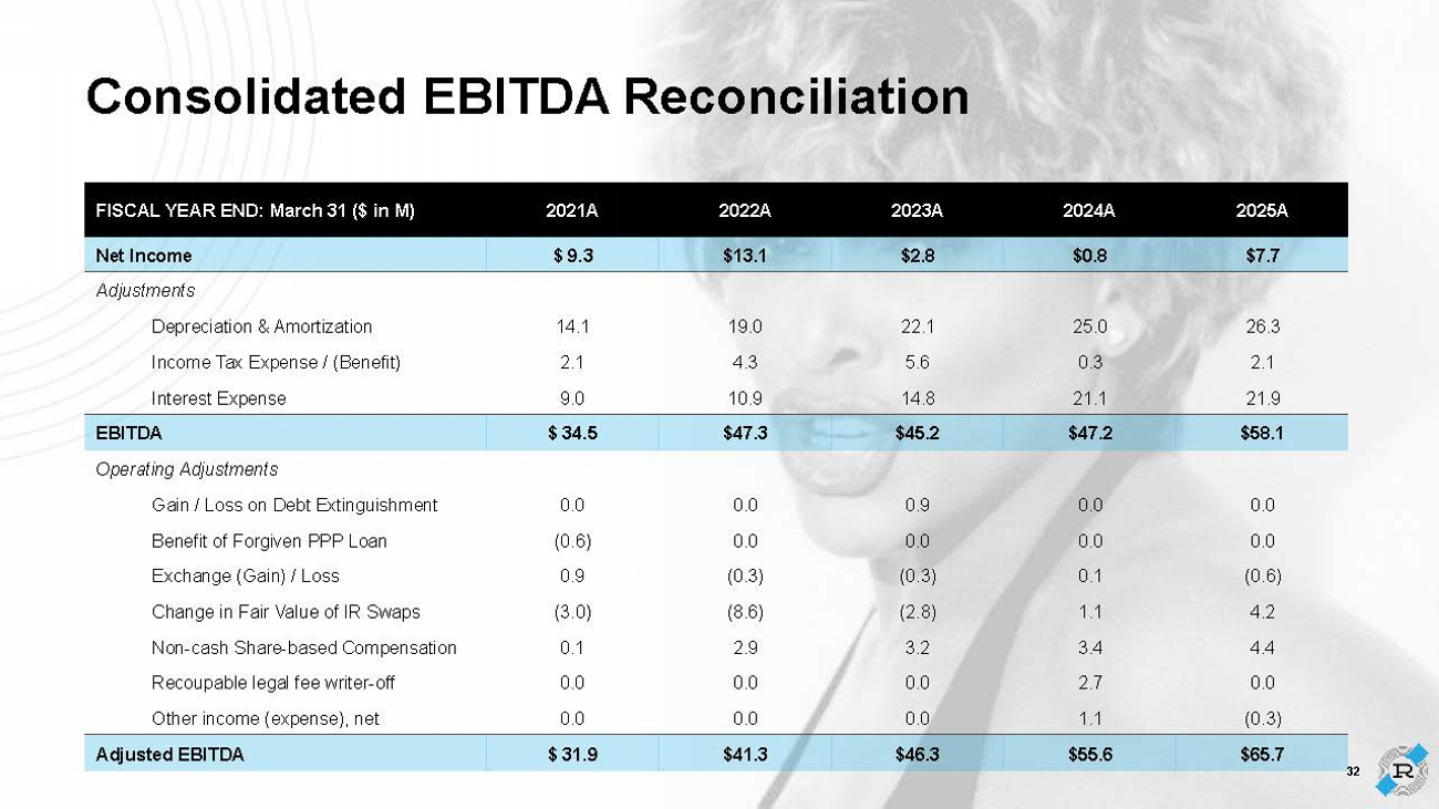 2025A 2024A 2023A 2022A 2021A财政年度终了:3月31日(百万美元)$ 7.7 $ 0.8 $ 2.8 $ 13.1 $ 9.3净收益调整26.325.02 2.1 19.01 4.1折旧和摊销2.10.35.64.3 2.1所得税费用/(收益)21.92 1.11 4.8 10.99.0利息费用$ 58.1 $ 47.2 $ 45.2 $ 47.3 $ 34.5 EBITDA经营调整0.0 0.0 0.9 0.0 0.0债务清偿损益0.0 0.0 0.0 0.0(0.6)免除PPP贷款的收益(0.6)0.1(0.3)0.9汇兑(收益)/损失4.2 1.1(2.8)(8.6)(3.0)投资者关系掉期公允价值变动4.4 3.43.2 2.9 0.1以非现金股份为基础的薪酬0.0 2.7 0.0 0.0 0.0可收回的律师费作家-关闭(0.3)1.10.0 0.0 0.0其他收入(费用),净额65.7美元55.6美元46.3美元41.3美元31.9美元调整后EBITDA 32合并EBITDA调节