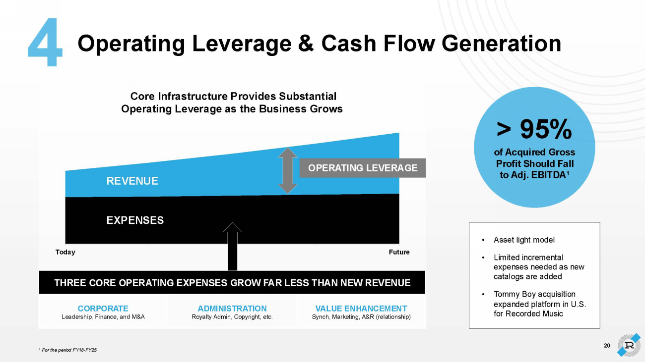 •轻资产模式•随着新目录的加入,所需的增量费用有限• Tommy Boy在美国收购的用于录制音乐核心基础设施的扩展平台提供了可观的运营杠杆,因为业务增长超过95%的收购毛利润应降至调整后。EBITDA 1三项核心运营费用的增长远低于新收入公司领导层、财务和并购管理版税管理、版权等。价值增强同步、市场营销、A & R(关系)今天未来经营杠杆收入支出经营杠杆和现金流产生201为18财年至25财年