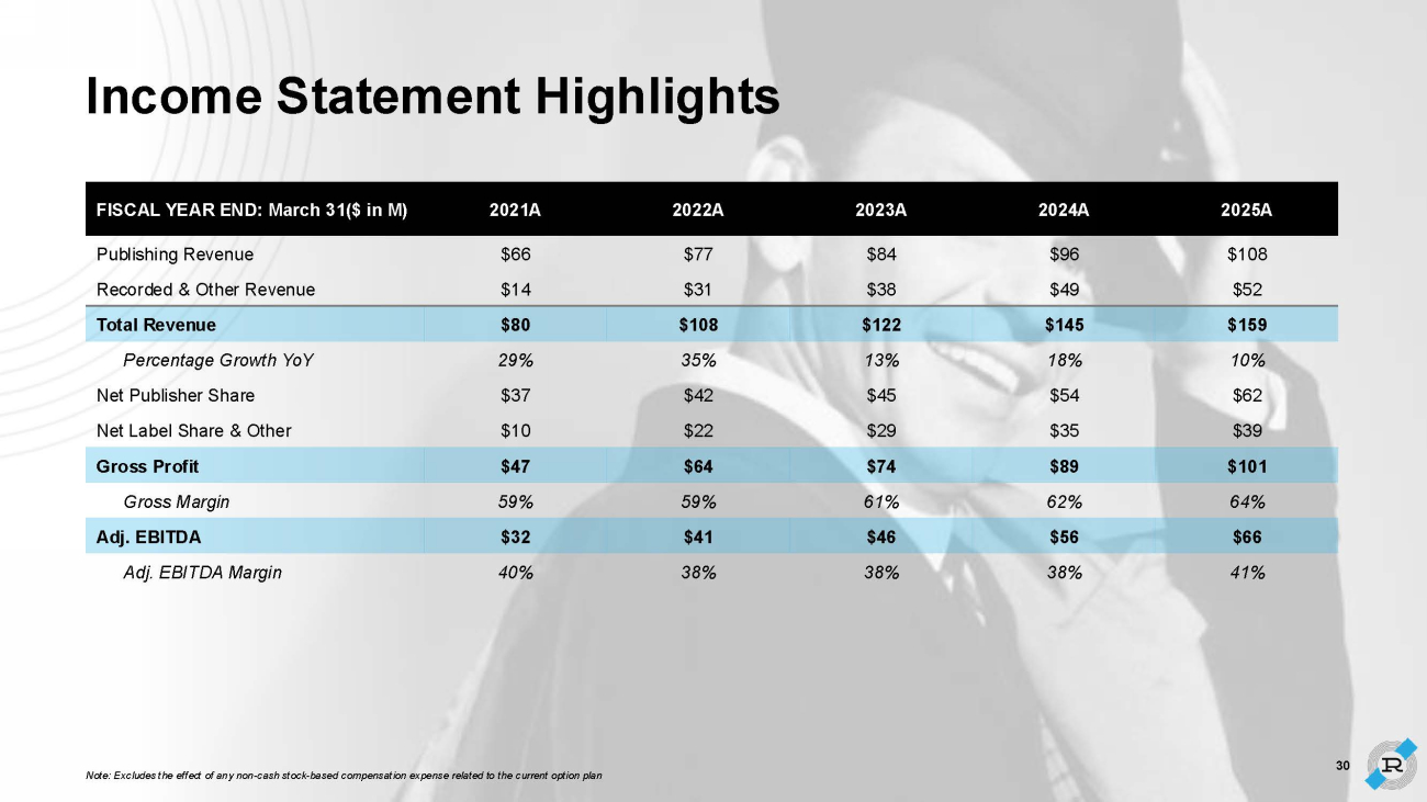 2025A 2024A 2023A 2022A 2021A财政年度终了:3月31日(百万美元)108美元96美元84美元77美元66美元出版收入52美元49美元38美元31美元14记录和其他收入159美元145美元122美元108美元80总收入10% 18% 13% 35% 29%百分比增长YoY 62美元54美元45美元42美元37净出版商份额39美元35美元29美元22美元10美元净标签份额和其他101美元89美元74美元64美元47毛利润64% 62% 61% 59% 59%毛利率66美元56美元46美元41美元32美元调整后EBITDA 41% 38% 38% 38% 40%调整后EBITDA利润率注:不包括y非现金的影响与当期期权计划相关的股票补偿费用损益表亮点30