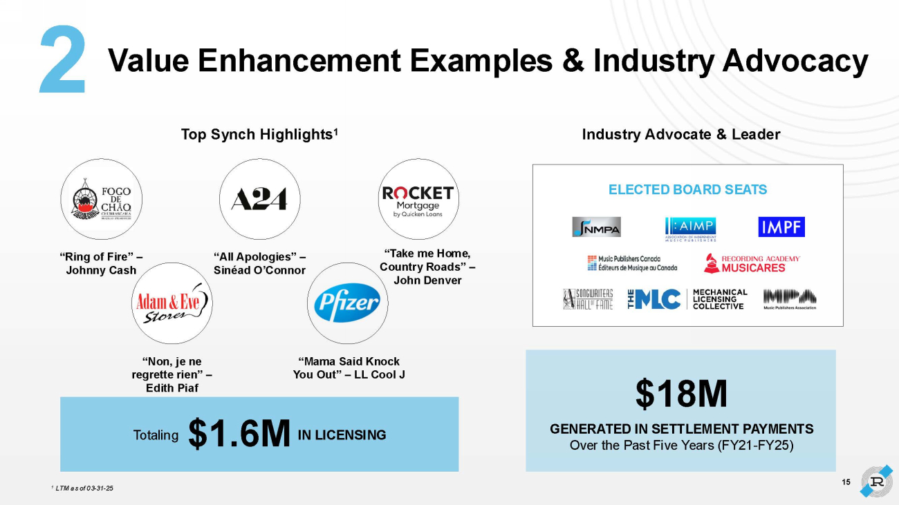 “Non,je ne regrettes rien”– Edith Piaf“Mama said knock you out”– LL Cool J“take me home,country roads”– John Denver“Ring of Fire”– Johnny Cash“all apologies”– Sin é ad O'Connor Top Synch Highlights 1 Industry Advocate & Leader $ 18 million generated in settlement payments over the past five years(FY21-FY25)value enhancement examples & industry advocacy totaling $ 16 million in licensing 15 elected board seats 1 LTM as of 03-31-25