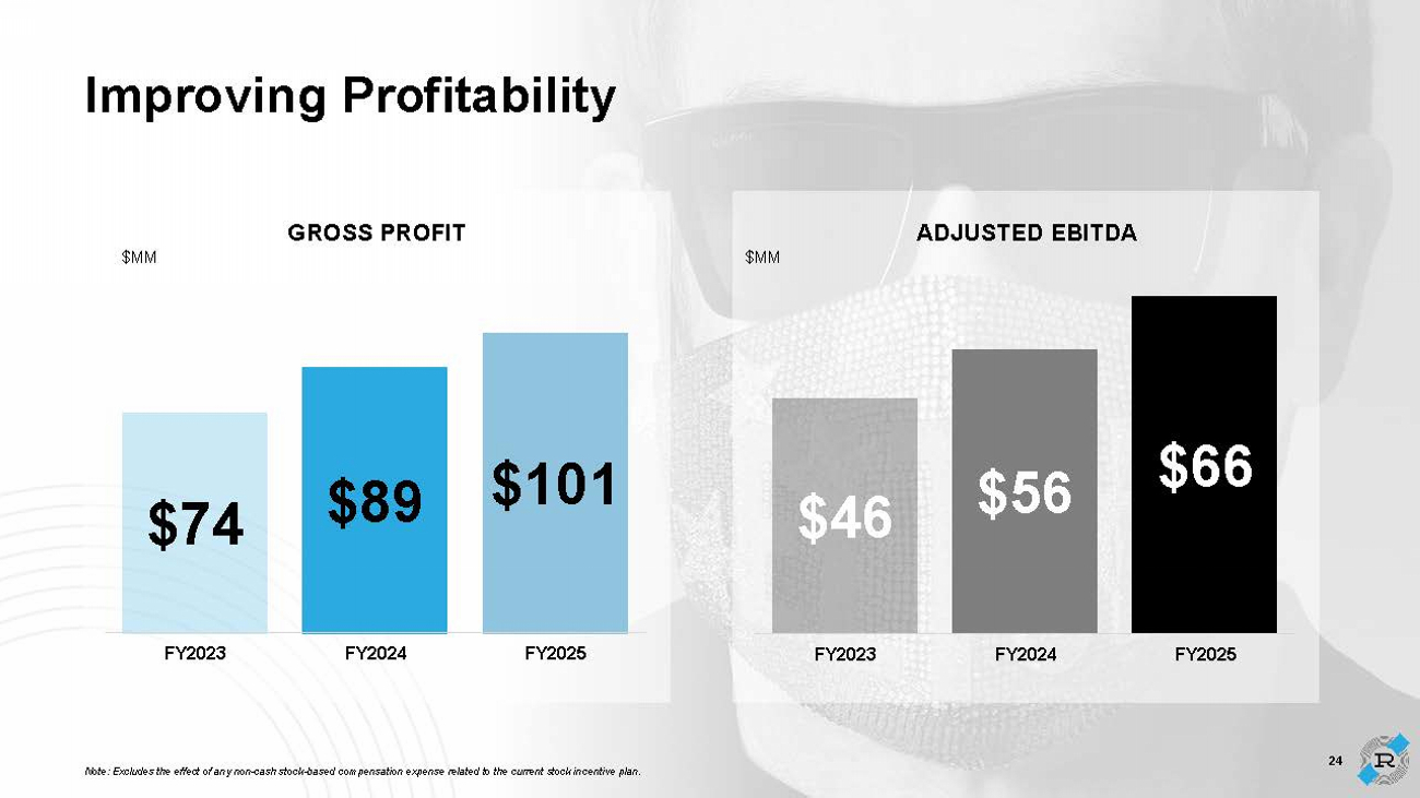 24注:不包括与当期股票激励计划相关的y非现金股票薪酬费用的影响。$ 74 $ 89 $ 101 FY2023 FY2024 FY2025毛利$ 46 $ 56 $ 66 FY2023 FY2024 FY2025调整后EBITDA改善盈利能力$ MM $ MM