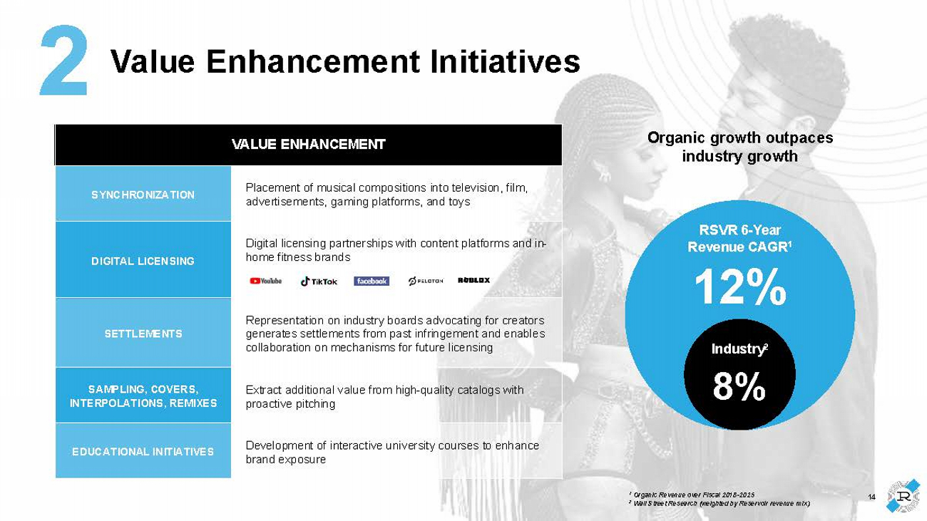 价值提升将音乐作品植入电视、电影、广告、游戏平台和玩具同步与内容平台和家庭健身品牌的数字许可合作伙伴关系在行业委员会上为创作者倡导的数字许可代表可以从过去的侵权行为中产生和解,并能够就未来许可解决的机制进行合作,通过主动的推销采样、封面、国际竞争,从高质量目录中提取额外价值,REMIXES开发交互式大学课程以提高品牌曝光率教育举措1或ganic收入超过2018财年-202 52华尔街研究(按水库收入组合加权)有机增长超过行业增长RSVR 6年收入CAGR11 %行业28%价值提升举措14