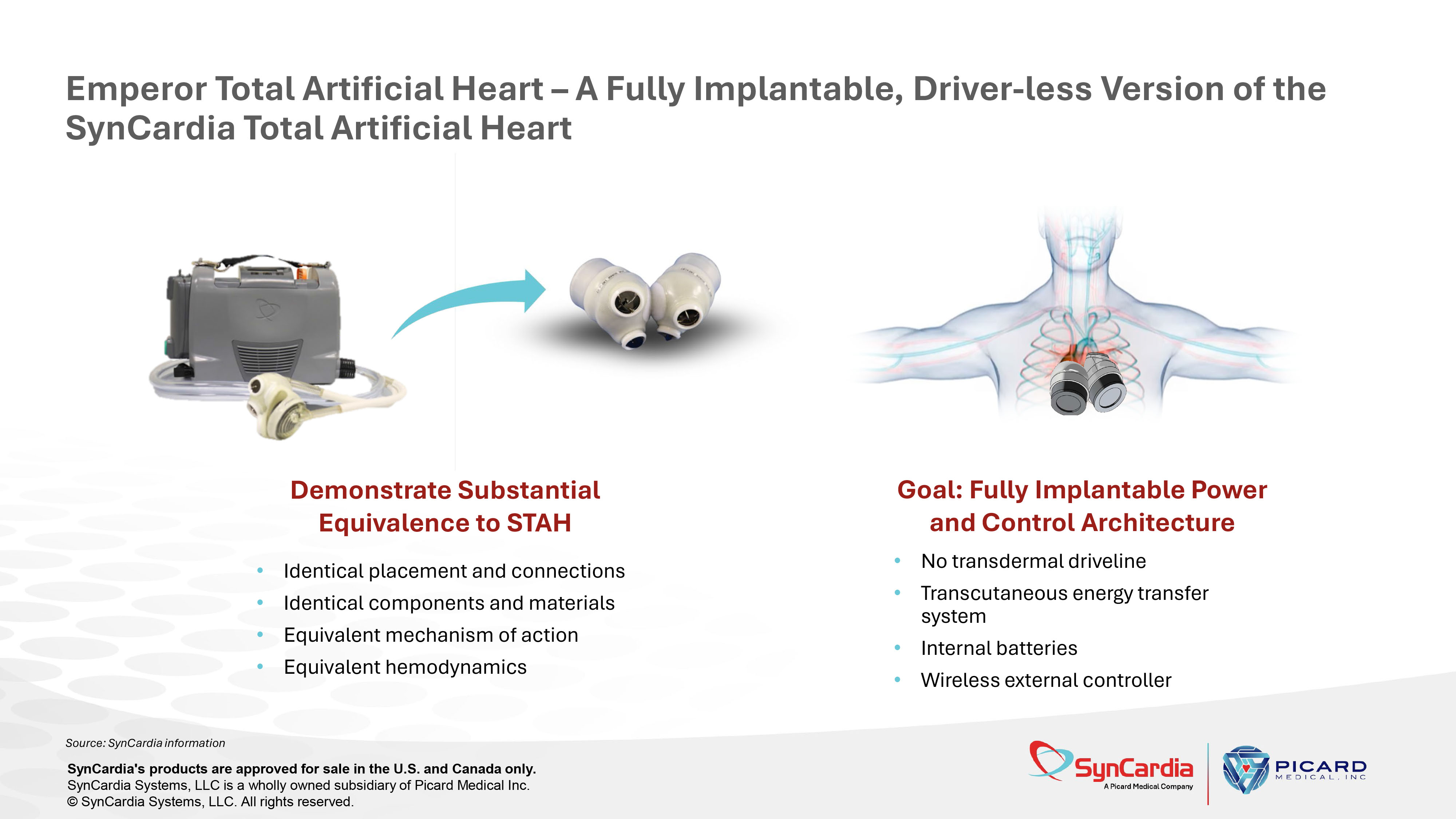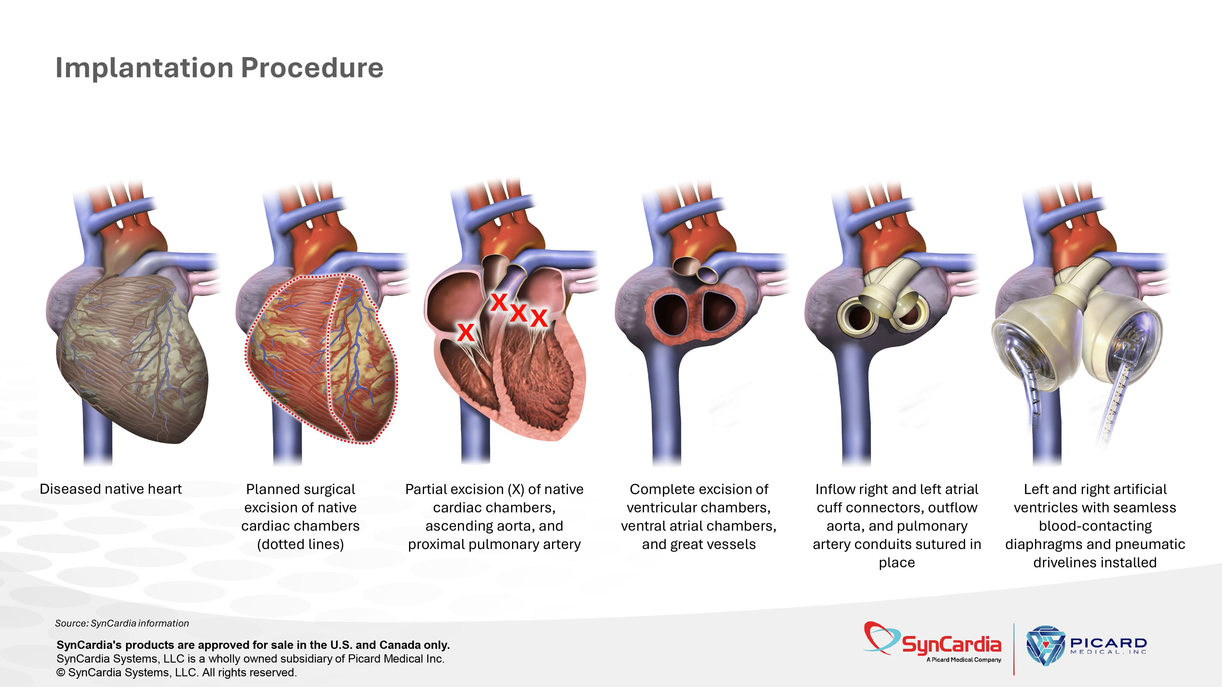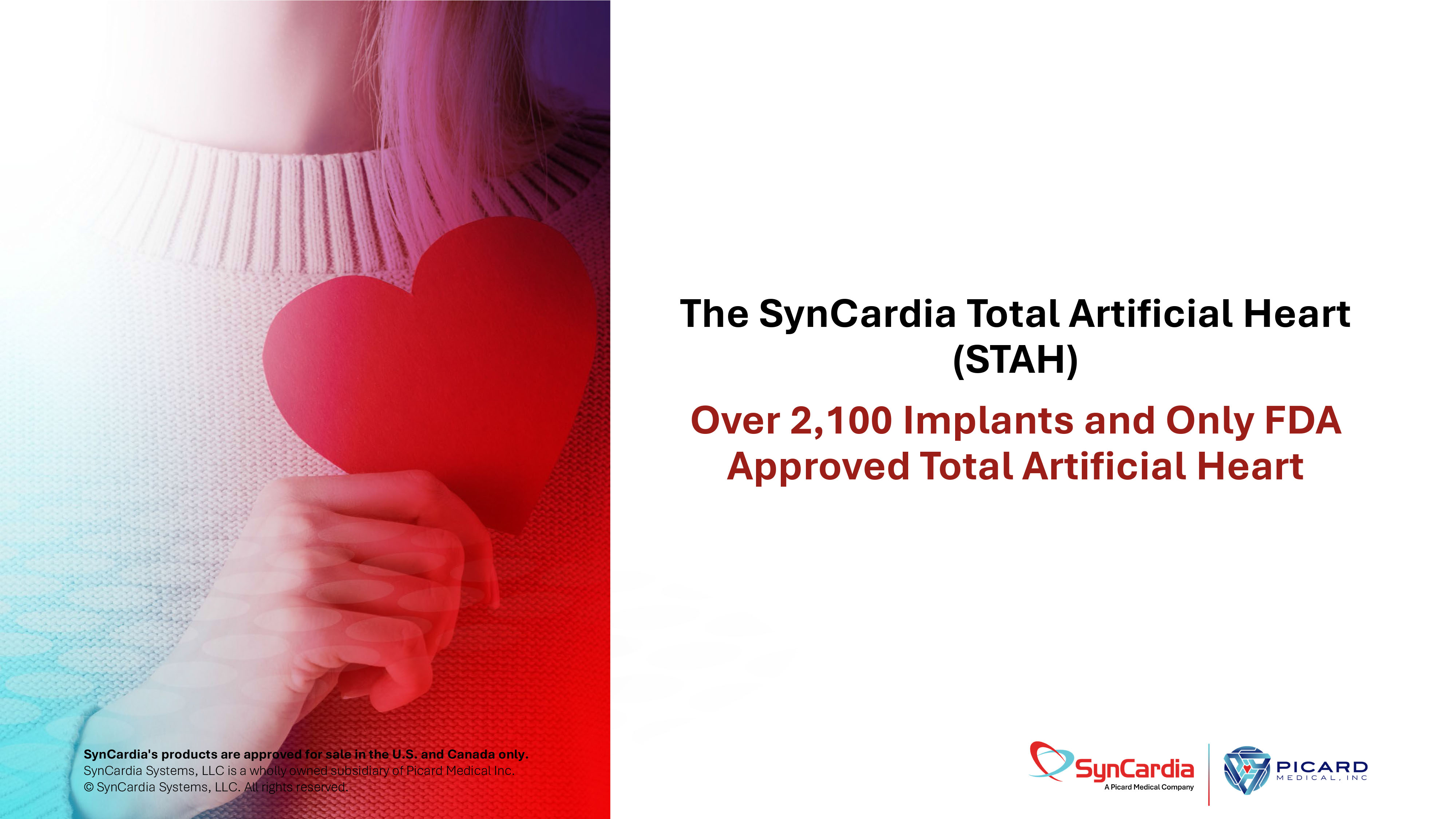 免责声明SynCardia的产品仅获准在美国和加拿大销售。SynCardia Systems,LLC是Picard Medical Inc.的全资子公司。©SynCardia系统有限责任公司。版权所有。General Picard Medical,Inc.(“PMI”)将在其业务运营和D s策略的更新中提供此演示文稿。本演示文稿中包含的信息并不旨在是完整的或包罗万象的,或包含潜在投资者可能需要的所有信息。我们鼓励潜在投资者通过美国证券交易委员会(“SEC”)EDGAR系统www.sec.gov和我们的网站www.picardmedical.com对本演示文稿中包含的信息以及重要的附加信息进行自己的分析和审查。前瞻性陈述本演示文稿包含1995年《私人证券诉讼改革法案》和其他适用证券法含义内的前瞻性陈述。除历史事实陈述外,所有陈述均为前瞻性陈述,包括但不限于有关公司未来财务状况、业务STR ETGY、预算、预计成本以及管理层对未来运营的计划和目标的陈述。诸如“预期”、“相信”、“估计”、“预期”、“打算”、“可能”、“计划”、“项目”、“将”、“将”、“可能”、“应该”等词语以及si mil ar表达旨在识别前瞻性陈述。此外,任何提及对未来事件或情况的预测、预测或其他特征的陈述,包括任何潜在的假设,都是重新前瞻性陈述。本演示文稿中的前瞻性陈述可能包括风险和不确定性,这些风险和不确定性是PMI最近提交或提供给SEC的10-Q和8-K表格中所描述并不时指出的。您还应仔细考虑PMI注册声明中描述的风险和不确定性以及通过引用或纳入PMI注册声明以及随后的当前、季度、d向SEC提交或提交的年度报告。这些文件或潜在文件可能会识别和解决其他重要风险和不确定性,这些风险和不确定性可能导致实际事件和结果与此处提及的前瞻性陈述中包含的内容存在重大差异。这些陈述是基于当前对公司经营所在行业和市场的预期、估计和预测,以及管理层的信念和SSU的承诺。这些陈述不是对未来业绩的保证,涉及某些难以预测的风险、不确定性和假设。实际结果可能与前瞻性陈述中表达或暗示的结果存在重大差异。公司不承担更新或修改任何前瞻性陈述的义务,无论是由于新信息、未来事件或其他原因,除非法律要求。没有要约或招揽本演示不构成出售要约或购买公司任何证券的要约招揽,没有r大厅在任何司法管辖区出售证券,在根据任何此类司法管辖区的证券法进行注册或获得资格之前,此类要约、招揽或出售在其中将是非法的。第三方信息本演示文稿中包含的某些信息是从第三方编制的已发布和未发布的来源获得的,在某些情况下,这些信息未经独立核实。虽然这些信息被认为是可靠的,但公司不对此类信息的准确性或完整性作出任何明示或暗示的陈述或保证。商标和版权所有本演示文稿中出现的所有商标、服务标记和商品名称均为其各自所有者的财产。本演示文稿的内容受版权保护,未经公司事先书面同意,不得复制、分发或使用。SynCardia Systems,LLC连同其各自的子公司、董事、高级职员、雇员、顾问和代理人,没有编制、核实或批准本演示文稿的内容,并明确表示不对其准确性、完整性或充分性承担任何责任或义务。上述任何一方均不就本演示文稿作出任何明示或暗示的陈述、保证或谅解,也不应在任何投资决策中依赖该陈述、保证或谅解。不应依赖这份以交易为重点的文件之外的所有通信,并且交易中的partic ipation否认以前的通信。