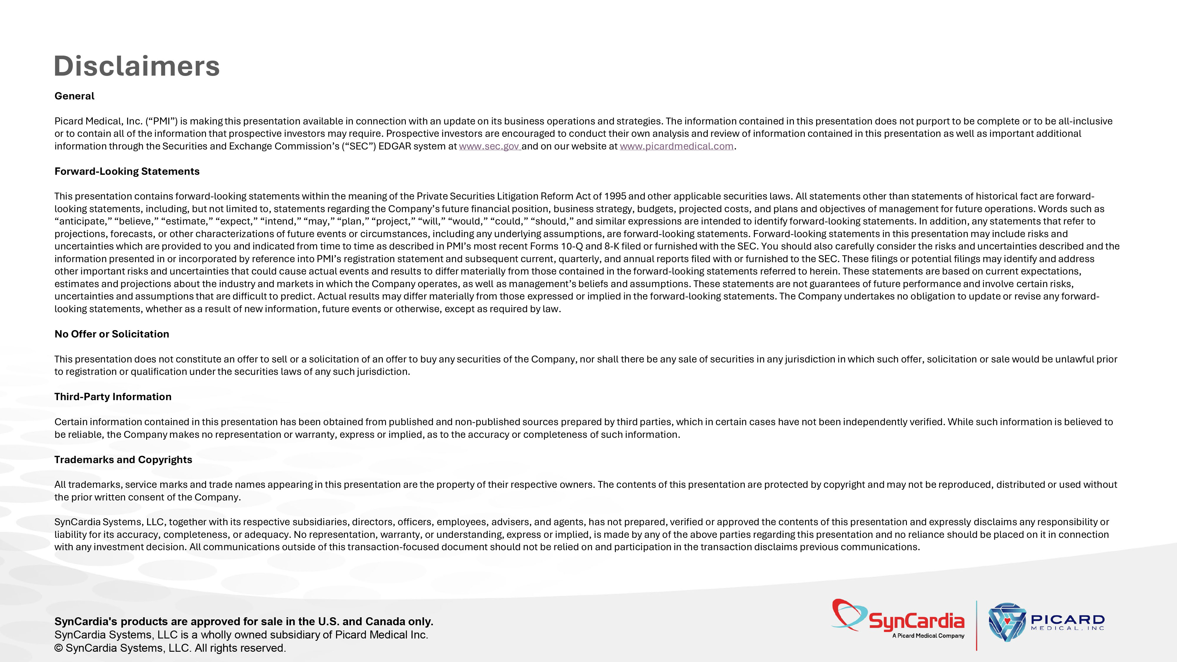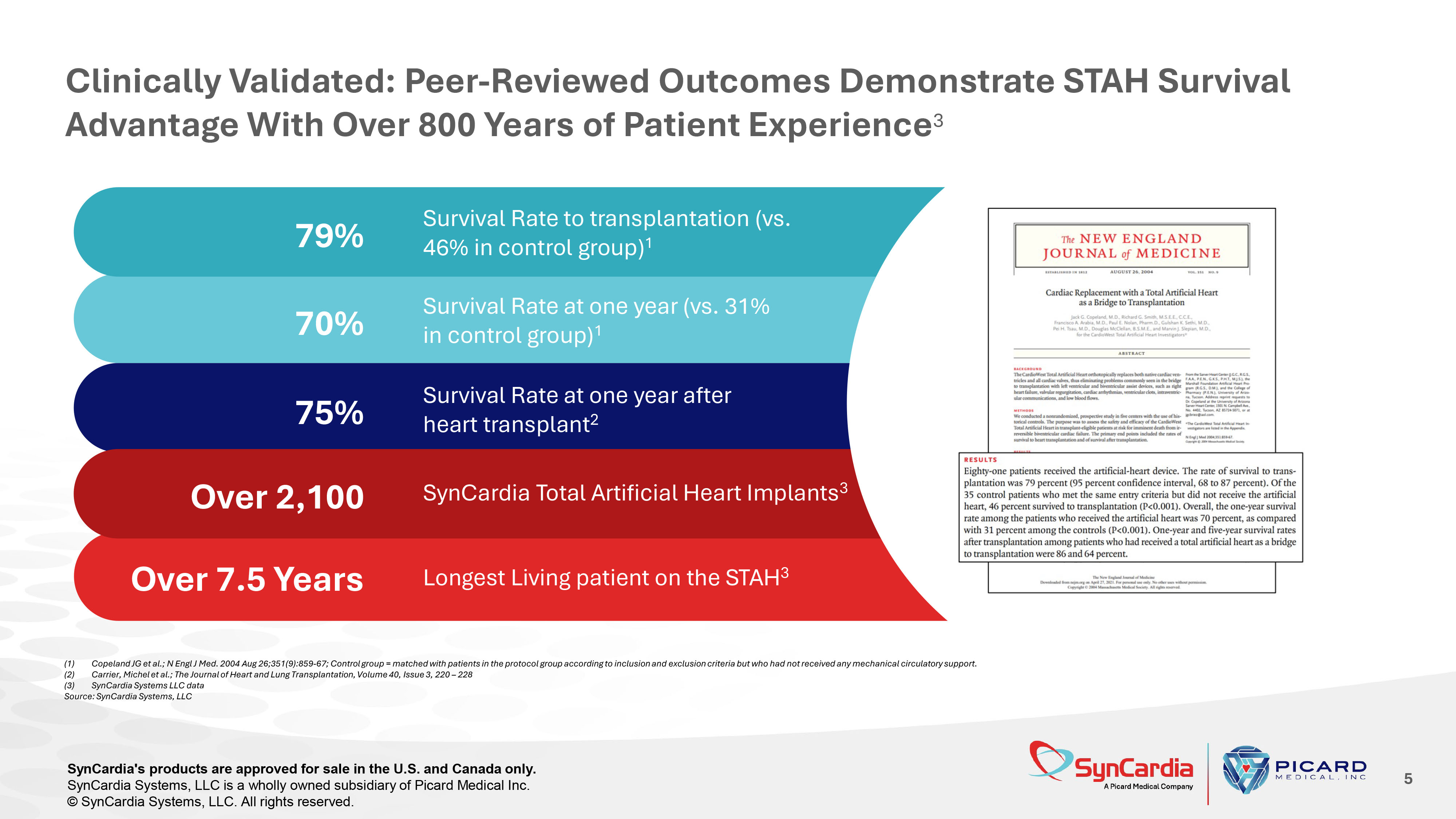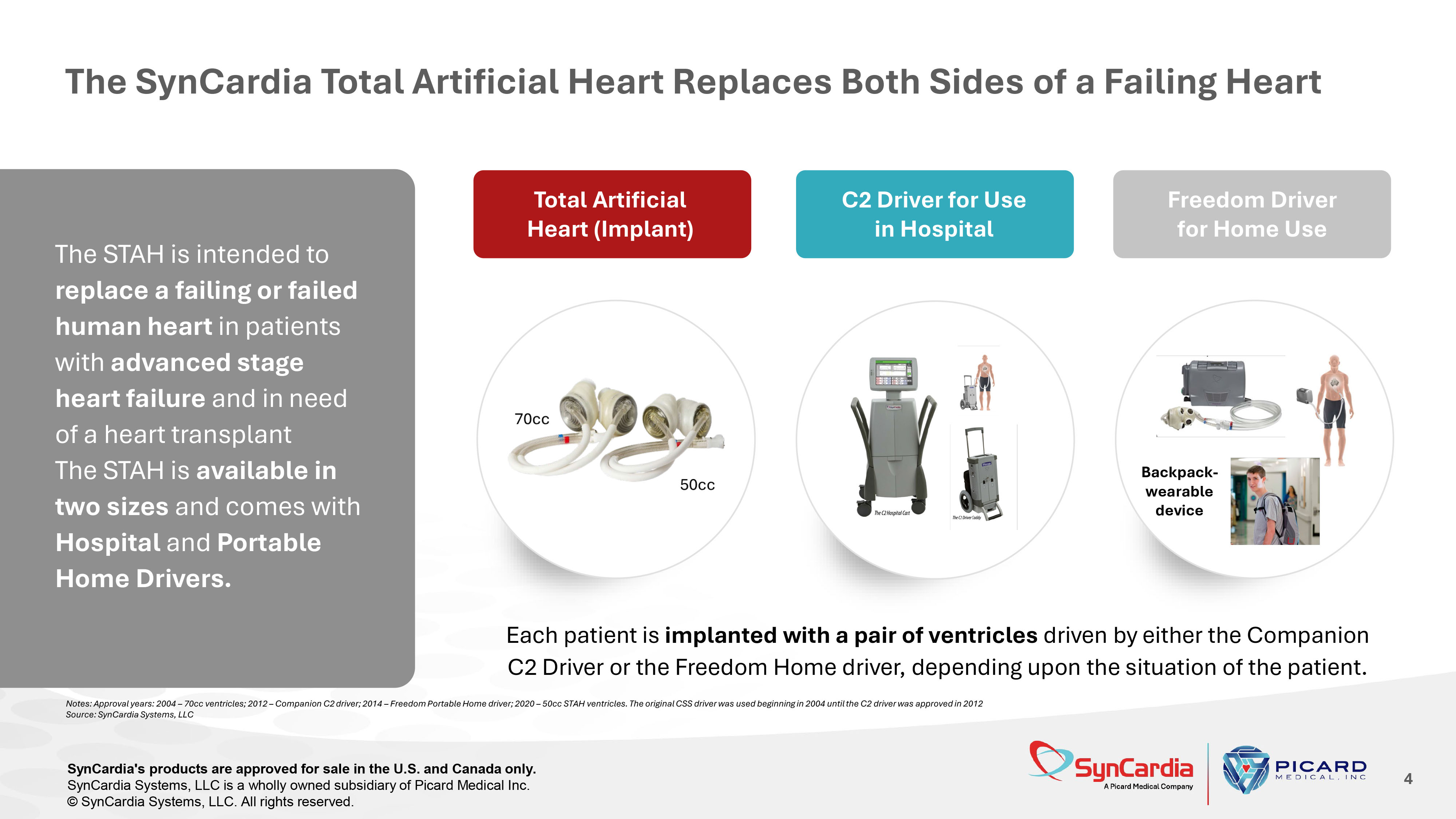 免责声明SynCardia的产品仅获准在美国和加拿大销售。SynCardia Systems,LLC是Picard Medical Inc.的全资子公司。©SynCardia系统有限责任公司。版权所有。General Picard Medical,Inc.(“PMI”)将在其业务运营和D s策略的更新中提供此演示文稿。本演示文稿中包含的信息并不旨在是完整的或包罗万象的,或包含潜在投资者可能需要的所有信息。我们鼓励潜在投资者通过美国证券交易委员会(“SEC”)EDGAR系统www.sec.gov和我们的网站www.picardmedical.com对本演示文稿中包含的信息以及重要的附加信息进行自己的分析和审查。前瞻性陈述本演示文稿包含1995年《私人证券诉讼改革法案》和其他适用证券法含义内的前瞻性陈述。除历史事实陈述外,所有陈述均为前瞻性陈述,包括但不限于有关公司未来财务状况、业务STR ETGY、预算、预计成本以及管理层对未来运营的计划和目标的陈述。诸如“预期”、“相信”、“估计”、“预期”、“打算”、“可能”、“计划”、“项目”、“将”、“将”、“可能”、“应该”等词语以及si mil ar表达旨在识别前瞻性陈述。此外,任何提及对未来事件或情况的预测、预测或其他特征的陈述,包括任何潜在的假设,都是重新前瞻性陈述。本演示文稿中的前瞻性陈述可能包括风险和不确定性,这些风险和不确定性是PMI最近提交或提供给SEC的10-Q和8-K表格中所描述并不时指出的。您还应仔细考虑PMI注册声明中描述的风险和不确定性以及通过引用或纳入PMI注册声明以及随后的当前、季度、d向SEC提交或提交的年度报告。这些文件或潜在文件可能会识别和解决其他重要风险和不确定性,这些风险和不确定性可能导致实际事件和结果与此处提及的前瞻性陈述中包含的内容存在重大差异。这些陈述是基于当前对公司经营所在行业和市场的预期、估计和预测,以及管理层的信念和SSU的承诺。这些陈述不是对未来业绩的保证,涉及某些难以预测的风险、不确定性和假设。实际结果可能与前瞻性陈述中表达或暗示的结果存在重大差异。公司不承担更新或修改任何前瞻性陈述的义务,无论是由于新信息、未来事件或其他原因,除非法律要求。没有要约或招揽本演示不构成出售要约或购买公司任何证券的要约招揽,没有r大厅在任何司法管辖区出售证券,在根据任何此类司法管辖区的证券法进行注册或获得资格之前,此类要约、招揽或出售在其中将是非法的。第三方信息本演示文稿中包含的某些信息是从第三方编制的已发布和未发布的来源获得的,在某些情况下,这些信息未经独立核实。虽然这些信息被认为是可靠的,但公司不对此类信息的准确性或完整性作出任何明示或暗示的陈述或保证。商标和版权所有本演示文稿中出现的所有商标、服务标记和商品名称均为其各自所有者的财产。本演示文稿的内容受版权保护,未经公司事先书面同意,不得复制、分发或使用。SynCardia Systems,LLC连同其各自的子公司、董事、高级职员、雇员、顾问和代理人,没有编制、核实或批准本演示文稿的内容,并明确表示不对其准确性、完整性或充分性承担任何责任或义务。上述任何一方均不就本演示文稿作出任何明示或暗示的陈述、保证或谅解,也不应在任何投资决策中依赖该陈述、保证或谅解。不应依赖这份以交易为重点的文件之外的所有通信,并且交易中的partic ipation否认以前的通信。
