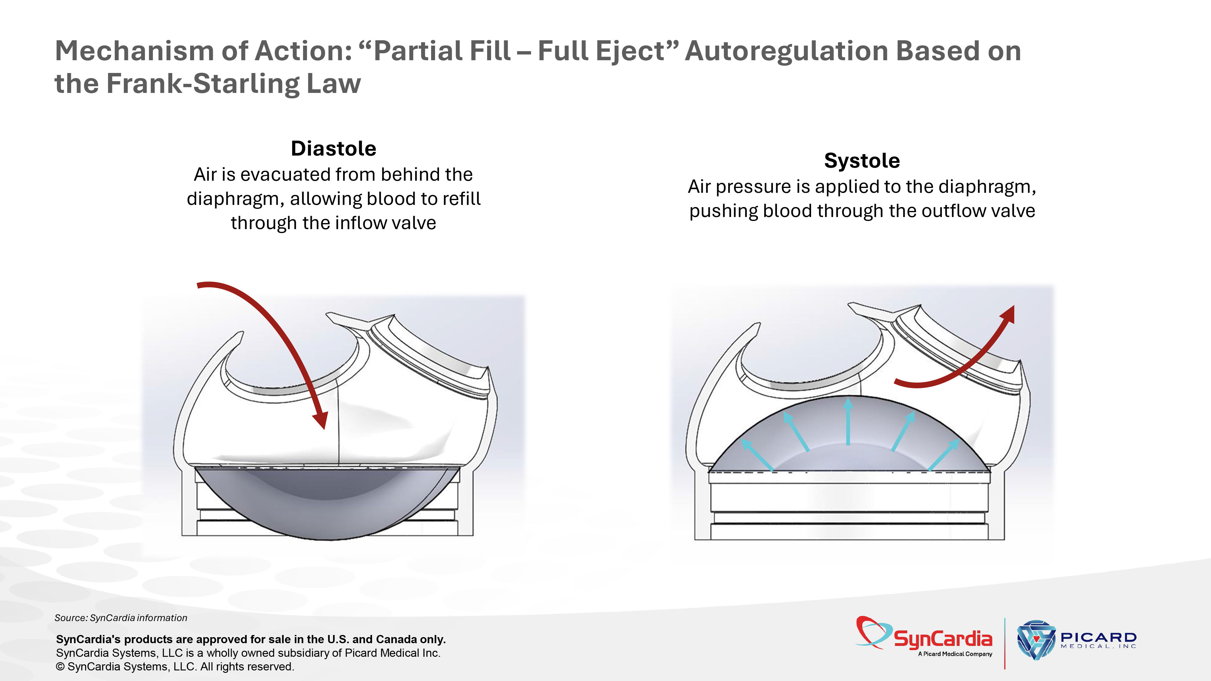 舒张空气从横膈膜后面抽空,让血液通过流入阀重新补充Systole空气压力被施加到横膈膜上,推动血液通过流出阀作用机制:“部分填充–完全喷射”基于Frank-Starling定律的自动调节来源:SynCardia信息SynCardia的产品仅获准在美国和加拿大销售。SynCardia Systems,LLC是Picard Medical Inc.的全资子公司。©SynCardia系统有限责任公司。版权所有。