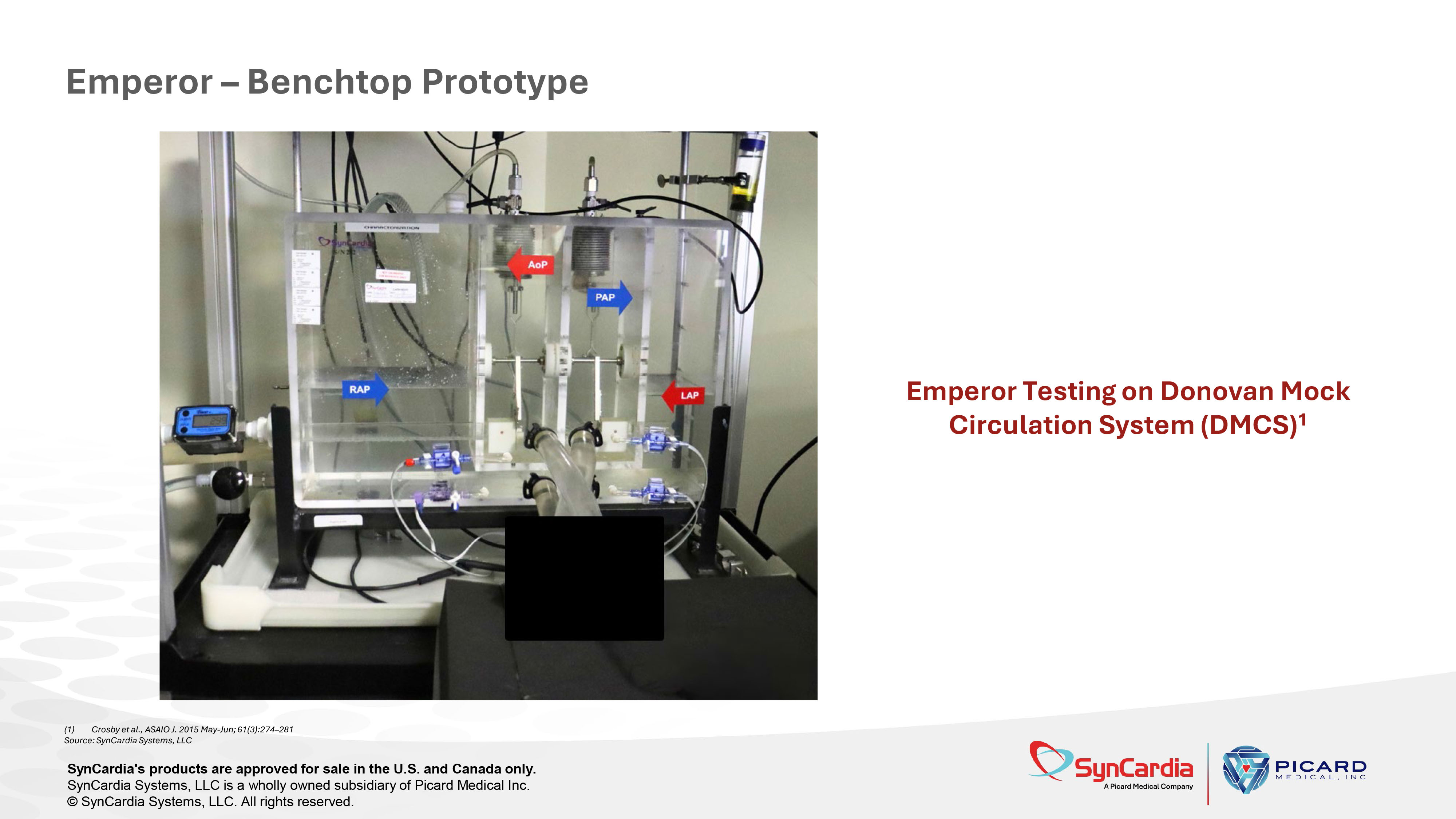 Emperor – Benchtop Prototype(1)Crosby et al.,ASAIO J. 2015 May-Jun;61(3):274 – 281资料来源:SynCardia Systems,LLC SynCardia的产品仅获准在美国和加拿大销售。SynCardia Systems,LLC是Picard Medical Inc.的全资子公司。©SynCardia系统有限责任公司。版权所有。帝王测试多诺万模拟循环系统(DMCS)1