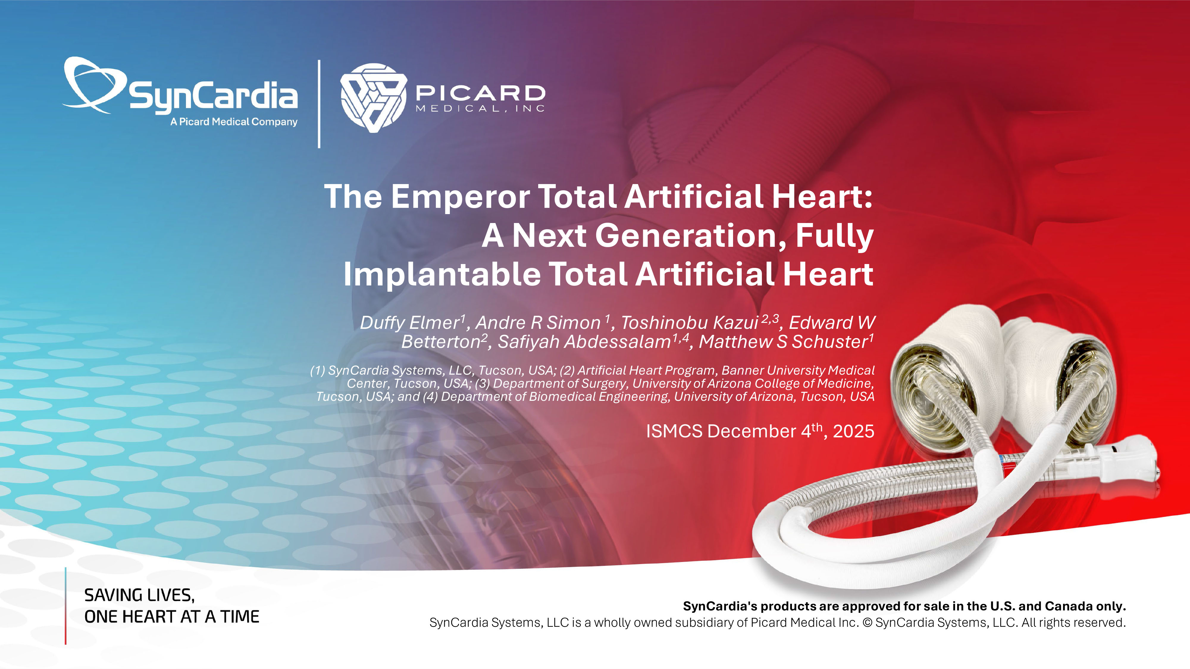 关于SynCardia Systems,LLC SynCardia Systems,LLC是Picard医疗公司,总部位于亚利桑那州图森市。我们制造和分销世界上唯一的美国食品和药物管理局(FDA)和加拿大卫生部批准的全人工心脏。SynCardia全人工心脏是世界上应用最广泛、研究最广泛的人工心脏。SynCardia全人工心脏(STAH)STAH已成功植入超2000例晚期心力衰竭患者。这种植入物是一种vai lable,有两种尺寸,以适应患者的不同生理状况。STAH已获准在美国和加拿大销售,用于有可能因双心室衰竭而立即死亡的符合条件的心脏移植患者。欧盟和国际批准正在等待中。如需更多信息和标签信息,请访问我们的网站www.syncardia.com。关于心力衰竭*心力衰竭(HF)是美国和其他发达国家日益增长的负担,原因是其人口老龄化。2023年约有670万人患有HF,据估计,晚期HF的患病率高达HF人群总数的25%。约30万(5%)晚期ST年龄HF难治指南定向治疗。医疗建议免责声明本材料中包含的信息,包括但不限于文本、图形、图像和其他组件,仅用于命名目的。本材料中的任何信息均无意替代专业医疗建议、诊断或治疗。如果您对医疗状况有任何疑问,请始终寻求您的医生或合格的医疗保健提供者的建议。永远不要因为你在本材料中读到的信息而忽视专业的医疗建议或拖延寻求它。*Bozkurt B,et al.,J卡失败。2023 Oct;29(10):1412-1451;(2)Abouezzeddine等人,充血性心脏衰竭。2011年7月-8月;17日(4):160-8日。SynCardia Systems,LLC是Picard Medical Inc.的全资子公司。©SynCardia系统有限责任公司。版权所有。SynCardia的产品仅在美国和加拿大获准销售。“Freedom”是SynCardia Systems,LLC的注册商标。“SynCardia Systems”、SynCardia标志、“给予时间的礼物”、“拯救生命,一次一个心”、“Companion 2 Driver”是SynCardia Systems,LLC的商标。纽交所:PMI