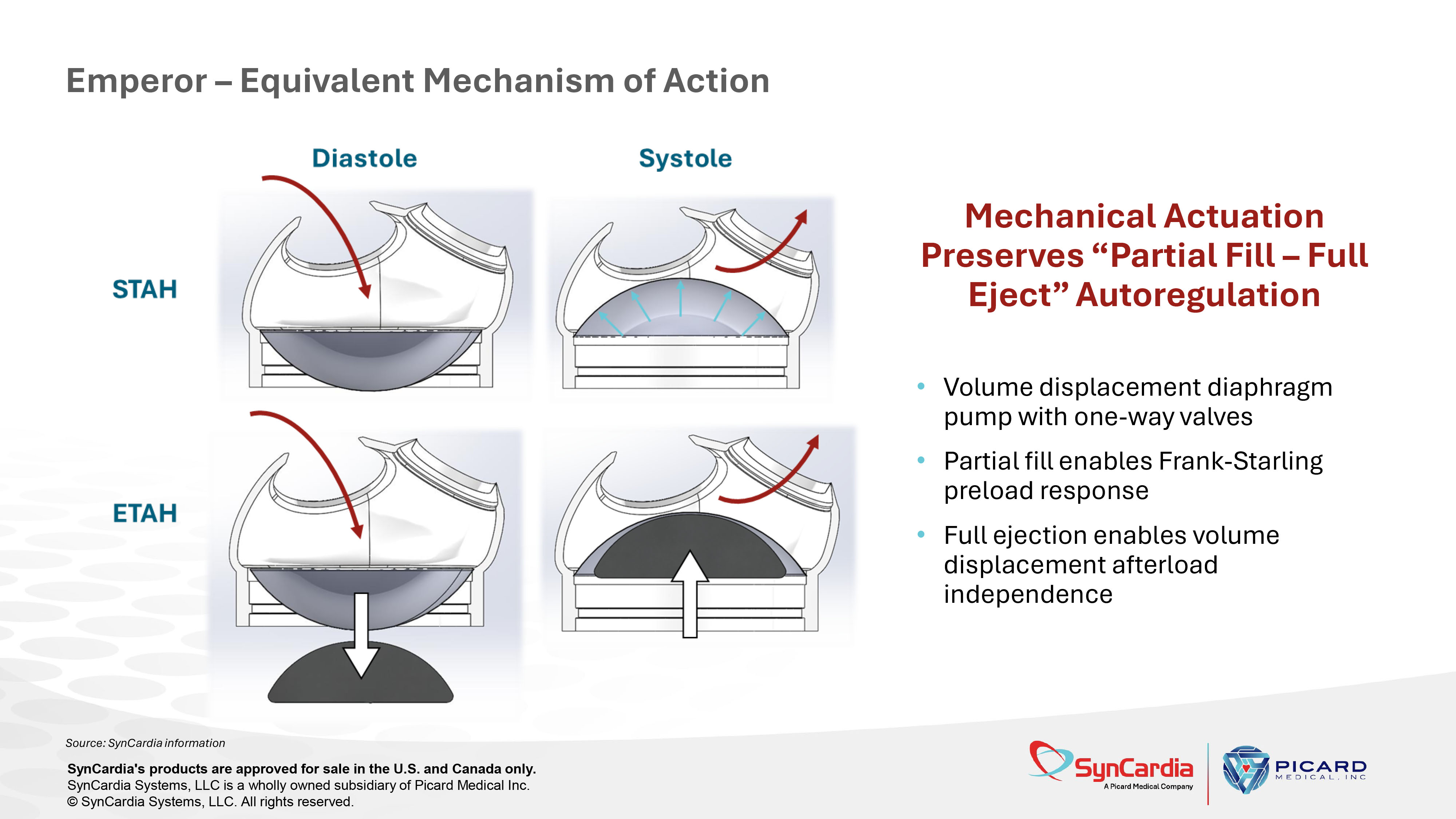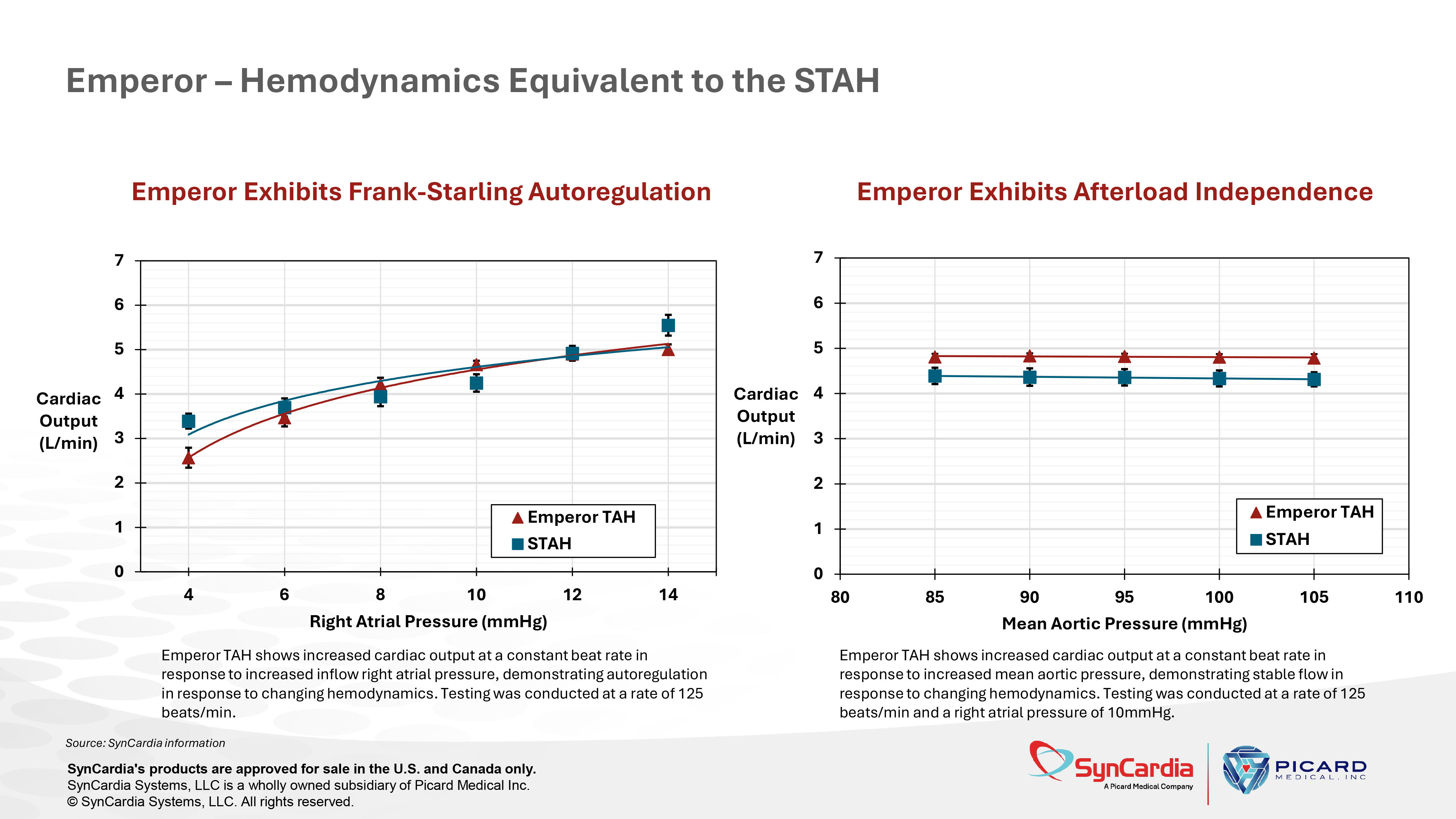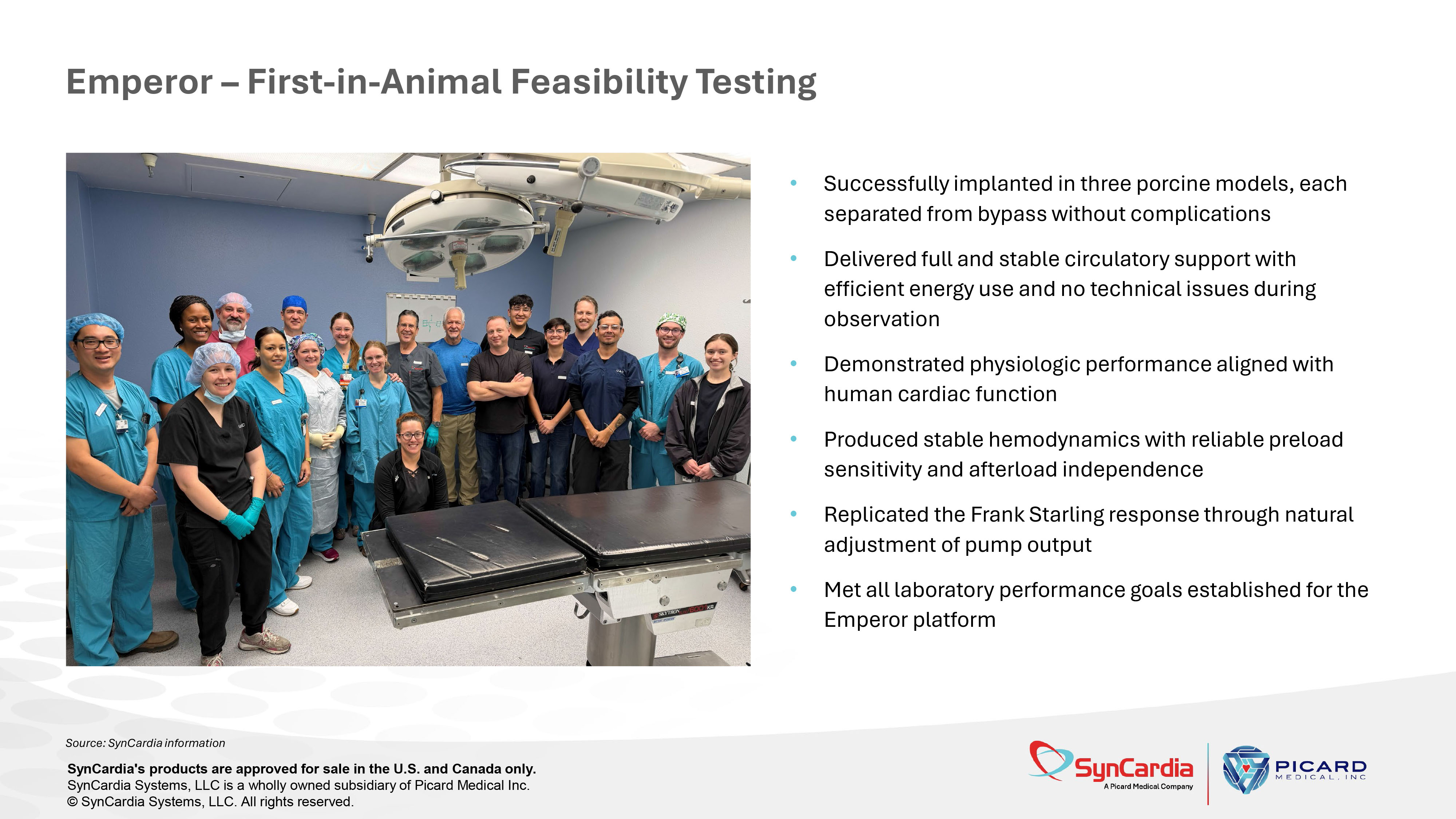 Emperor – First-in-Animal Feasibility Testing SynCardia的产品仅获准在美国和加拿大销售。SynCardia Systems,LLC是Picard Medical Inc.的全资子公司。©SynCardia系统有限责任公司。版权所有。•成功植入三个猪模型,每个模型都与旁路分离,没有并发症•提供充分稳定的循环支持,能量使用高效,观察期间没有技术问题•表现出与人体心脏功能一致的生理表现•产生了稳定的血流动力学,具有可靠的前负荷敏感性和后负荷独立性•通过自然调整泵输出复制Frank Starling反应•达到为Emperor平台建立的所有实验室性能目标来源:SynCardia信息