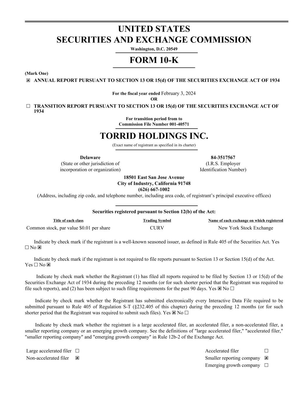美国证券交易委员会Washington,D.C. 20549 Form 10-K(Mark One)根据1934年证券交易法第13或15(d)条提交的截至2024年2月3日的财政年度的年度报告或根据1934年证券交易法第13或15(d)条提交的过渡期间为从到☐01-40571 TORRID HOLDINGS INC.(注册人的确切名称在其章程中指定)特拉华州84-3517567(州或公司注册地其他司法管辖区加利福尼亚州91748(626)667-1002(注册人主要行政办公室的地址,包括邮政编码和电话号码,包括区号)根据该法第12(b)节注册的证券:各类名称交易代码注册普通股的每个交易所的名称,每股面值0.01美元的CURV纽约证券交易所如果注册人是《证券法》第405条所定义的知名的经验丰富的发行人,请用复选标记表示。是☐否如果根据该法案第13条或第15(d)条的规定,注册人没有必要提交报告,请用复选标记表示。是☐否用复选标记表明注册人(1)在过去12个月内(或要求注册人提交此类报告的较短期限内)是否已提交1934年证券交易法第13或15(d)条要求提交的所有报告,并且(2)在过去90天内是否已遵守此类提交要求。是否☐用复选标记表明注册人在过去12个月内(或要求注册人提交此类文件的较短期限内)是否以电子方式提交了根据S-T规则第405条(本章第232.405条)要求提交的每个交互式数据文件。是否☐用复选标记指明注册人是大型加速申报人、加速申报人、非加速申报人、较小的报告公司还是新兴成长型公司。见《交易法》第12b-2条中“大型加速申报人”、“加速申报人”、“小型报告公司”和“新兴成长型公司”的定义。大型加速申报者☐加速申报者丨丨非加速申报者较小的报告公司新兴成长型公司☐