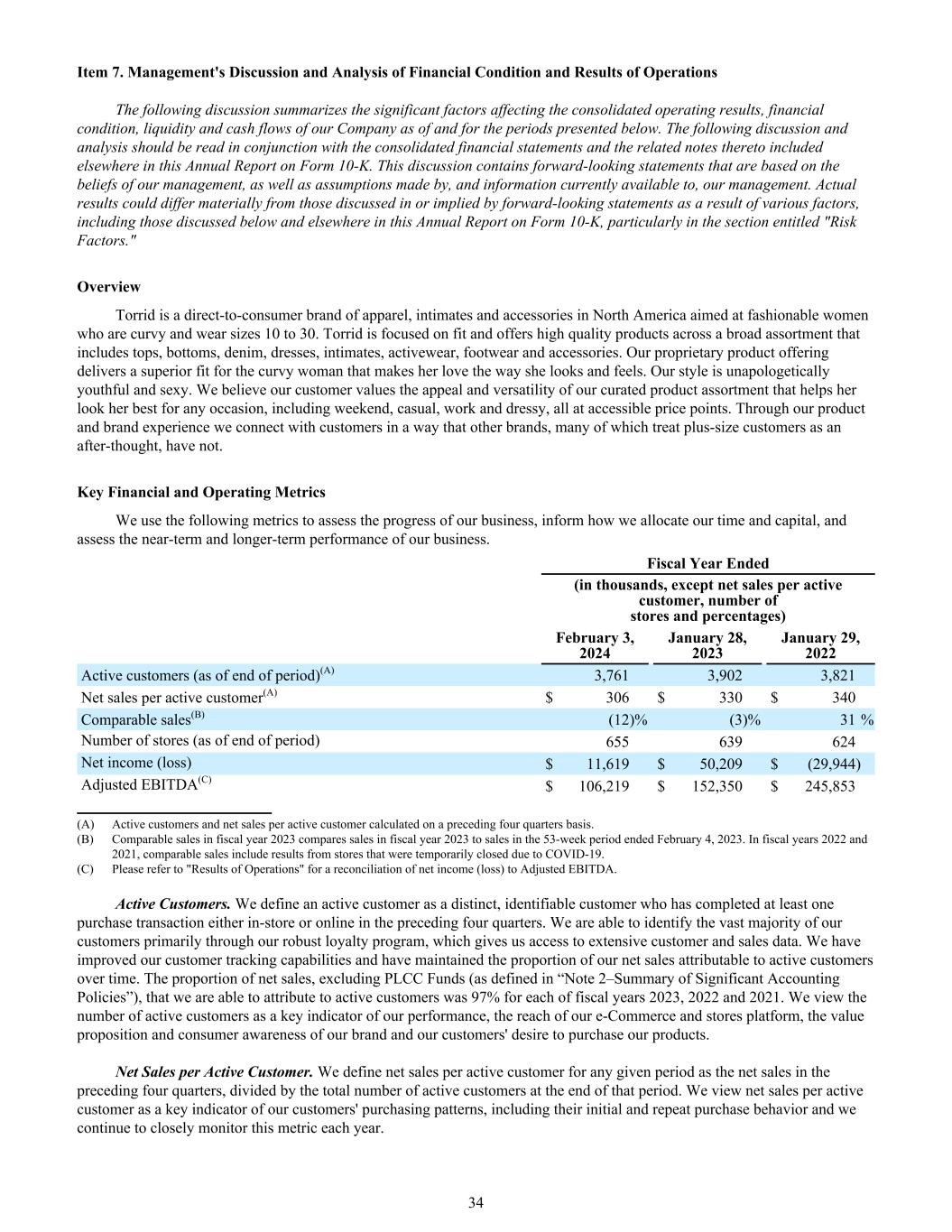 项目7。管理层对财务状况和经营成果的讨论与分析以下讨论总结了影响我们公司截至下文所述期间的综合经营成果、财务状况、流动性和现金流量的重要因素。以下讨论和分析应与合并财务报表及其相关附注一起阅读,这些报表包含在本年度报告其他地方的10-K表格中。本讨论包含基于我们管理层的信念的前瞻性陈述,以及我们管理层做出的假设和目前可获得的信息。由于各种因素,实际结果可能与前瞻性陈述中讨论或暗示的结果存在重大差异,包括下文和本年度报告10-K表格其他部分讨论的因素,特别是在题为“风险因素”的部分。Overview Torrid是北美一个直接面向消费者的服装、贴身内衣和配饰品牌,面向曲线美、穿10到30码的时尚女性。Torrid专注于合身,提供包括上衣、下装、牛仔布、连衣裙、贴身内衣、运动服、鞋类和配饰在内的广泛种类的高品质产品。我们的专有产品为曲线优美的女性提供了一种优越的贴合性,这让她喜欢她的外表和感觉。我们的风格是毫无歉意的青春和性感。我们相信,我们的客户重视我们精心策划的产品分类的吸引力和多功能性,这有助于她在任何场合都看起来最好,包括周末、休闲、工作和着装,所有这些都在平易近人的价位上。通过我们的产品和品牌体验,我们以其他品牌没有的方式与客户建立联系,其中许多品牌将大码客户视为事后诸葛亮。关键财务和运营指标我们使用以下指标来评估我们的业务进展,告知我们如何分配我们的时间和资金,并评估我们业务的近期和长期表现。截至财政年度(以千为单位,除每位活跃客户的净销售额、门店数量和百分比)2024年2月3日2023年1月28日2022年1月29日活跃客户(截至期末)(a)3,7613,9023,821每位活跃客户的净销售额(a)$ 306 $ 330 $ 340可比销售额(b)(12)%(3)% 31%门店数量(截至期末)655639624净收入(亏损)$ 11,619 $ 50,209 $(29,944)调整后EBITDA(c)$ 106,219 $ 152,350 $ 245,853(a)活跃客户和每位活跃客户的净销售额按前四个季度计算。(b)2023财年的可比销售额将2023财年的销售额与截至2023年2月4日的53周期间的销售额进行比较。在2022和2021财年,可比销售额包括因新冠疫情而暂时关闭的门店的业绩。(c)有关净收益(亏损)与调整后EBITDA的对账,请参阅“运营结果”。活跃客户。我们将活跃客户定义为在前四个季度中至少在店内或线上完成了一笔购买交易的可识别的独特客户。我们能够主要通过我们强大的忠诚度计划来识别我们的绝大多数客户,这使我们能够访问广泛的客户和销售数据。我们提高了客户跟踪能力,并随着时间的推移保持了归属于活跃客户的净销售额比例。在2023、2022和2021财年,我们能够归因于活跃客户的净销售额(不包括PLCC基金(定义见“附注2 –重要会计政策摘要”)的比例分别为97%。我们将活跃客户的数量视为我们的业绩、我们的电子商务和商店平台的覆盖范围、我们品牌的价值主张和消费者意识以及客户购买我们产品的愿望的关键指标。每个活跃客户的净销售额。我们将任何特定时期的每位活跃客户的净销售额定义为前四个季度的净销售额,除以该时期结束时的活跃客户总数。我们将每位活跃客户的净销售额视为客户购买模式的关键指标,包括他们的首次和重复购买行为,我们每年继续密切监测这一指标。34