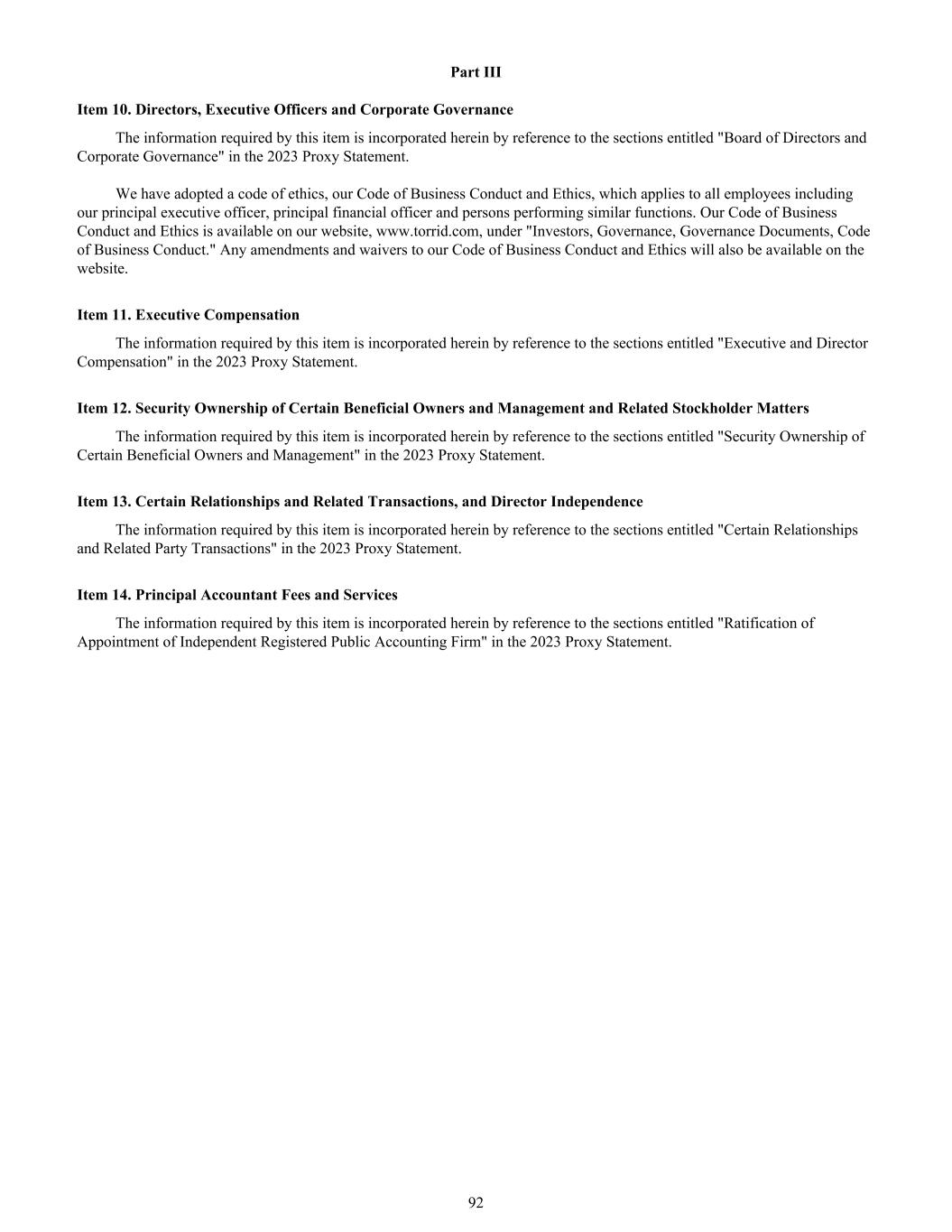 第三部分第10项。董事、执行官和公司治理本项目所要求的信息通过引用2023年代理声明中标题为“董事会和公司治理”的部分并入本文。我们采用了道德准则,即我们的商业行为和道德准则,适用于所有员工,包括我们的首席执行官、首席财务官和履行类似职能的人员。我们的商业行为和道德准则可在我们的网站www.torrid.com的“投资者、治理、治理文件、商业行为准则”下查阅。我们的商业行为和道德准则的任何修订和豁免也将在网站上提供。项目11。高管薪酬本项目所要求的信息通过引用2023年代理声明中标题为“高管和董事薪酬”的部分并入本文。项目12。某些受益所有人和管理层及相关股东事项的证券所有权本项目所要求的信息通过引用2023年代理声明中题为“某些受益所有人和管理层的证券所有权”的部分并入本文。项目13。某些关系和关联交易、董事独立性本项目所要求的信息通过引用2023年代理声明中题为“某些关系和关联方交易”的章节并入本文。项目14。首席会计师费用和服务本项目所要求的信息通过引用2023年代理声明中题为“批准聘任独立注册会计师事务所”的章节并入本文。92