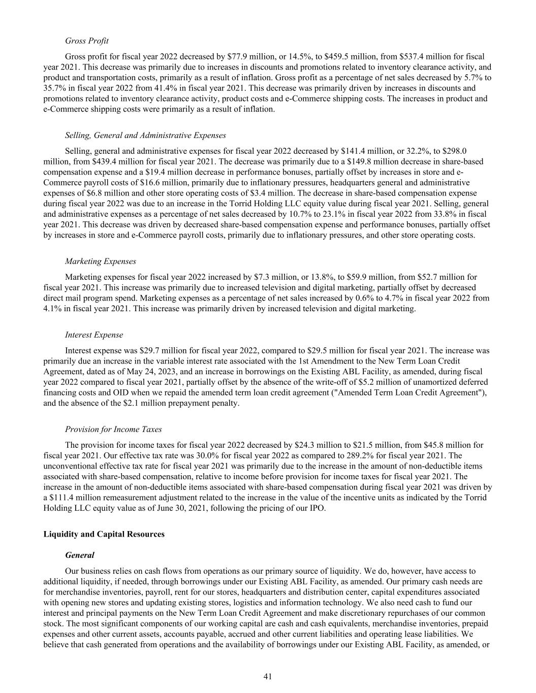 毛利润2022财年的毛利润从2021财年的5.374亿美元减少7790万美元,或14.5%,至4.595亿美元。这一减少主要是由于与库存清理活动相关的折扣和促销活动以及产品和运输成本增加,主要是由于通货膨胀。毛利润占净销售额的百分比从2021财年的41.4%下降5.7%至2022财年的35.7%。这一下降主要是由于与库存清理活动、产品成本和电子商务运输成本相关的折扣和促销活动增加。产品和电子商务运输成本的增加主要是通货膨胀的结果。销售、一般和行政费用2022财年的销售、一般和行政费用从2021财年的4.394亿美元减少1.414亿美元,或32.2%,至2.980亿美元。减少的主要原因是基于股份的薪酬费用减少1.498亿美元,绩效奖金减少1940万美元,部分被商店和电子商务工资成本增加1660万美元所抵消,这主要是由于通货膨胀压力、总部一般和行政费用680万美元以及其他商店运营成本340万美元。2022财年股权报酬费用减少是由于2021财年Torrid Holding LLC股权价值增加。销售、一般和管理费用占净销售额的百分比从2021财年的33.8%下降10.7%至2022财年的23.1%。这一下降是由于股权激励费用和绩效奖金减少,但部分被主要由于通胀压力导致的门店和电子商务工资成本增加以及其他门店运营成本所抵消。营销费用2022财年的营销费用从2021财年的5270万美元增加730万美元,或13.8%,至5990万美元。这一增长主要是由于电视和数字营销增加,但部分被直邮节目支出减少所抵消。营销费用占净销售额的百分比从2021财年的4.1%增长0.6%至2022财年的4.7%。这一增长主要是由电视和数字营销增加推动的。利息支出2022财年的利息支出为2970万美元,而2021财年的利息支出为2950万美元。增加的主要原因是与截至2023年5月24日的新定期贷款信贷协议第1修正案相关的可变利率增加,以及与2021财年相比,经修订的现有ABL融资在2022财年的借款增加,部分被我们在偿还经修订的定期贷款信贷协议(“经修订的定期贷款信贷协议”)时没有注销520万美元的未摊销递延融资成本和OID以及没有210万美元的提前还款罚款所抵消。所得税拨备2022财年的所得税拨备从2021财年的4580万美元减少2430万美元至2150万美元。我们2022财年的有效税率为30.0%,而2021财年为289.2%。2021财年的非常规有效税率主要是由于与2021财年所得税拨备前收入相比,与股份薪酬相关的不可扣除项目金额增加。2021财年与基于股份的薪酬相关的不可扣除项目金额的增加是由与激励单位价值增加相关的1.114亿美元的重新计量调整推动的,正如我们的IPO定价之后,截至2021年6月30日的Torrid Holding LLC股权价值所示。流动性和资本资源一般我们的业务依赖运营现金流作为我们流动性的主要来源。然而,如果需要,我们确实可以通过经修订的现有ABL融资下的借款获得额外的流动性。我们的主要现金需求是商品库存、工资、我们的门店、总部和配送中心的租金、与开设新门店和更新现有门店相关的资本支出、物流和信息技术。我们还需要现金来为我们在新的定期贷款信贷协议上的利息和本金支付提供资金,并对我们的普通股进行酌情回购。我们营运资金中最重要的组成部分是现金和现金等价物、商品库存、预付费用和其他流动资产、应付账款、应计和其他流动负债以及经营租赁负债。我们认为,经修订的运营产生的现金和我们现有ABL融资下的借款可用性或41
