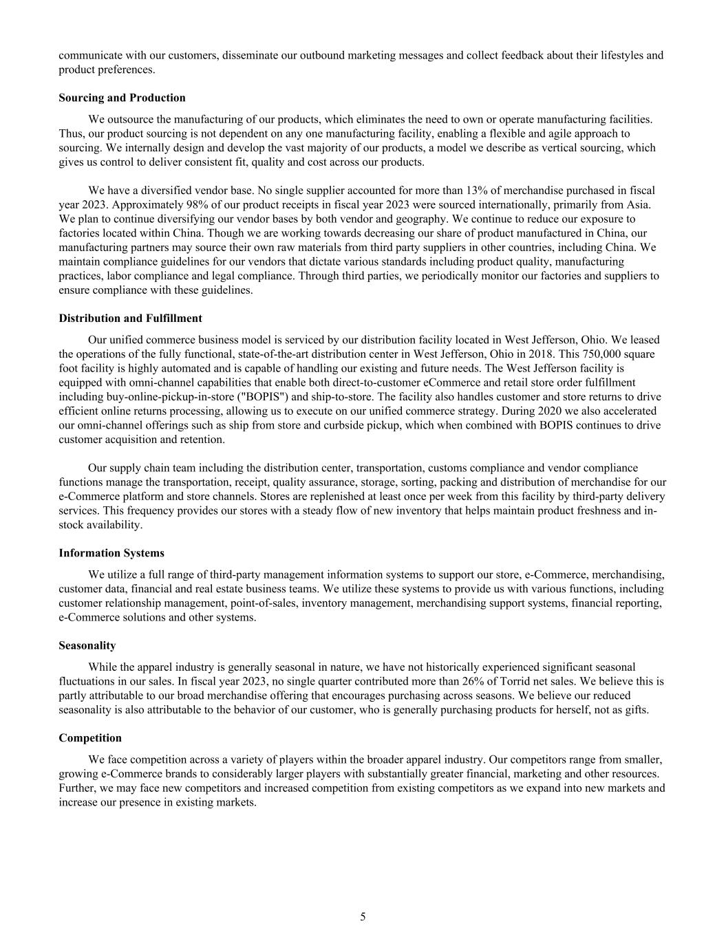与我们的客户沟通,传播我们的外呼营销信息并收集有关他们的生活方式和产品偏好的反馈。采购和生产我们将产品的制造外包,从而无需拥有或运营制造设施。因此,我们的产品采购不依赖于任何一个制造设施,从而能够采用灵活和敏捷的采购方法。我们在内部设计和开发绝大多数产品,我们将这种模式描述为垂直采购,这使我们能够控制在我们的产品中提供一致的契合度、质量和成本。我们拥有多元化的供应商基础。2023财年采购的商品中,没有单一供应商占比超过13%。2023财年我们约98%的产品收入来自国际,主要来自亚洲。我们计划继续按供应商和地域使我们的供应商基础多样化。我们继续减少对位于中国境内工厂的风险敞口。尽管我们正在努力降低在中国制造的产品所占份额,但我们的制造合作伙伴可能会从包括中国在内的其他国家的第三方供应商那里采购自己的原材料。我们为我们的供应商维护合规准则,这些准则规定了各种标准,包括产品质量、制造实践、劳工合规和法律合规。通过第三方,我们定期监测我们的工厂和供应商,以确保遵守这些准则。分销和履行我们的统一商业业务模式由我们位于俄亥俄州西杰斐逊的分销设施提供服务。我们于2018年租用了位于俄亥俄州西杰斐逊的功能齐全、最先进的配送中心的运营。这个75万平方英尺的设施高度自动化,能够处理我们现有和未来的需求。West Jefferson工厂配备了全渠道能力,可实现直接面向客户的电子商务和零售店订单履行,包括在线购买-店内提货(“BOPIS”)和船舶到店。该设施还处理客户和商店退货,以推动高效的在线退货处理,使我们能够执行我们的统一商务战略。在2020年,我们还加快了从门店发货和路边取货等全渠道产品,当与BOPIS相结合时,这些产品将继续推动客户获取和保留。我们的供应链团队包括配送中心、运输、海关合规和供应商合规职能,为我们的电子商务平台和门店渠道管理商品的运输、收货、质量保证、存储、分拣、包装和分销。商店每周至少通过第三方配送服务从该设施补货一次。这一频率为我们的门店提供了稳定的新库存流动,有助于保持产品新鲜度和库存可用性。信息系统我们利用全方位的第三方管理信息系统来支持我们的门店、电子商务、商品销售、客户数据、金融和房地产业务团队。我们利用这些系统为我们提供各种功能,包括客户关系管理、销售点、库存管理、商品销售支持系统、财务报告、电子商务解决方案等系统。季节性虽然服装行业在本质上通常是季节性的,但我们的销售在历史上没有经历过明显的季节性波动。2023财年,没有一个季度贡献了Torrid净销售额的26%以上。我们认为,这部分归功于我们广泛的商品供应,鼓励跨季节采购。我们认为,我们减少的季节性也归因于我们的客户的行为,他们一般是为自己购买产品,而不是作为礼物。竞争我们面临着更广泛的服装行业内各种参与者的竞争。我们的竞争对手从规模较小、不断增长的电子商务品牌,到拥有大量财务、营销和其他资源的相当大的参与者。此外,随着我们扩展到新市场并增加我们在现有市场的存在,我们可能会面临新的竞争对手和来自现有竞争对手的更多竞争。5