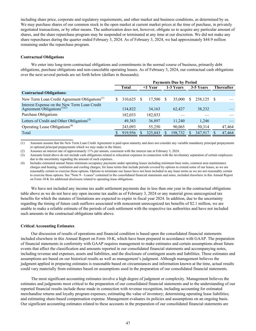 包括股价、公司和监管要求,以及由我们确定的其他市场和商业条件。我们可能会在公开市场上以购买时的当前市场价格、私下协商交易或通过其他方式购买我们普通股的股票。然而,该授权并不要求我们收购任何特定数量的股份,我们可酌情随时暂停或终止股份回购计划。截至2024年2月3日的季度,我们没有进行任何股票回购。截至2024年2月3日,我们在回购计划下剩余约4490万美元。合同义务我们在正常业务过程中订立长期合同义务和承诺,主要是债务义务、购买义务和不可撤销的经营租赁。截至2024年2月3日,我们在未来几个期间的合同现金债务如下(单位:千美元)。各期到期付款合计< 1年1-3年3-5年后合同义务:新的定期贷款信贷协议义务(1)310,625美元17,500美元35,000美元258,125美元——新的定期贷款信贷协议义务的利息费用(1)(2)134,82234,16362,42738,232 ——购买义务182,033182,033 ——信用证和其他义务(3)49,38336,89711,2401,246 ——经营租赁义务(4)243,09355,25090,06550,31447,464合计919,956美元325,843美元198,732美元347,917美元47,464(1)金额承担新的定期贷款信贷协议是在到期时支付的,不考虑我们未来可能进行的任何可变的强制性本金提前还款或可选的本金提前还款。(2)假设年利率约为11%,与2024年2月3日的利率一致。(3)上述金额不包括与某些雇员非自愿离职有关的搬迁费用相关的现金义务,因为此类费用的金额存在不确定性。(4)包括经营租赁项下的估计年度未来最低占用付款,包括最低基本租金、公共区域维护费以及供暖、通风和冷却费,租赁条款包括延长我们部分租约的选择权所涵盖的期间,因为我们有理由确定将行使这些选择权。终止我们租约的选择权并未包含在任何租赁条款中,因为我们无法合理确定会行使这些选择权。有关经营租赁义务的额外披露,请参阅合并财务报表和附注中包含的“附注9 —租赁”,该报表和附注包含在本年度报告10-K表格的其他部分。由于截至2024年2月3日,我们没有任何公开的所得税审计,也没有任何预计诉讼时效将于2024财年到期的重大未确认税收优惠总额,因此我们没有在上述合同义务表中包括任何在不到一年内到期的所得税审计结算付款。此外,由于与210万美元的非流动未确认税收优惠相关的未来现金流出的时间存在不确定性,我们无法对与相关税务当局进行现金结算的期间做出可靠估计,也没有将这些金额包括在上述合同义务表中。关键会计估计我们对经营业绩和财务状况的讨论是基于本年度报告其他地方的10-K表格中包含的合并财务报表,这些报表是根据公认会计原则编制的。按照公认会计原则编制财务报表要求管理层对影响我们合并财务报表和随附附注中报告的分类和金额的未来事件做出估计和某些假设,包括收入和支出、资产和负债,以及披露或有资产和负债。这些估计和假设是基于我们的历史结果以及管理层的判断。尽管管理层认为,根据当时已知的情况和信息,在编制估计时应用的判断是合理的,但实际结果可能与基于编制我们的合并财务报表时使用的假设的估计存在重大差异。最重大的会计估计涉及高度的判断或复杂性。管理层认为,对编制我们的合并财务报表和理解我们报告的财务业绩最关键的估计和判断包括与收入确认相关的估计和判断, 包括核算估计的商品退货和忠诚计划费用;估计库存价值;确定经营租赁负债;估计基于股份的补偿费用。管理层持续评估其政策和假设。我们在编制合并财务报表时与这些账目相关的重要会计估计为47
