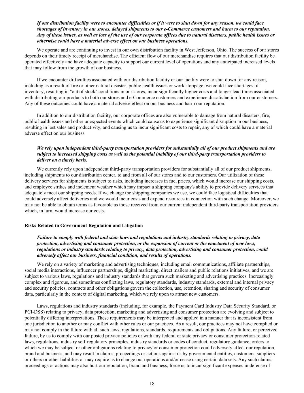 如果我们的分销设施遇到困难或由于任何原因关闭,我们可能会面临门店库存短缺、延迟向我们的电子商务客户发货以及损害我们的声誉。任何这些问题,以及由于自然灾害、公共卫生问题或其他原因而失去对我们公司办公室的使用,都可能对我们的业务运营产生重大不利影响。我们运营并正在继续投资于我们在俄亥俄州西杰斐逊的分销设施。我们商店的成功取决于他们及时收到商品。我们商品的高效流动要求我们的分销设施有效运营,并有足够的能力来支持我们目前的运营水平以及随着我们业务的增长可能出现的任何预期的增加水平。如果我们遇到与我们的分销设施相关的困难,或者我们的设施因任何原因关闭,包括由于火灾或其他自然灾害、公共卫生问题或停工,我们可能会面临库存短缺,从而导致我们的商店出现“缺货”情况,产生与向我们的商店和电子商务客户分销我们的产品相关的显着更高的成本和更长的交货时间,并遇到客户的不满。任何这些结果都可能对我们的业务产生重大不利影响,并损害我们的声誉。除了我们的分销设施外,我们的公司办公室还容易受到自然灾害、火灾、公共卫生问题和其他意外事件的破坏,这些事件可能导致我们的业务受到重大干扰,导致销售和生产力损失,并导致我们承担大量维修成本,其中任何一项都可能对我们的业务产生重大不利影响。我们几乎所有的产品发货都依赖独立的第三方运输供应商,并受到运输成本增加以及我们的第三方运输供应商可能无法及时交付的影响。我们目前基本上依赖独立的第三方运输供应商来运送我们所有的产品,包括运送到我们的配送中心、往返于我们所有商店和客户的货物。我们利用这些交付服务进行运输会面临风险,包括燃料价格上涨,这将增加我们的运输成本,以及员工罢工和恶劣天气,这可能会影响航运公司提供足以满足我们运输需求的交付服务的能力。如果我们改变我们使用的航运公司,我们可能会面临物流困难,这可能会对交付产生不利影响,我们将因这种改变而产生成本和消耗资源。此外,我们可能无法获得像从我们目前的独立第三方运输供应商那里获得的那样优惠的条款,这反过来又会增加我们的成本。与政府监管和诉讼相关的风险未能遵守与隐私、数据保护、广告和消费者保护相关的联邦和州法律法规和行业标准,或扩大当前或颁布与隐私、数据保护、广告和消费者保护相关的新法律、法规或行业标准,可能会对我们的业务、财务状况和经营业绩产生不利影响。我们依赖各种营销和广告技术,包括电子邮件通信、联盟伙伴关系、社交媒体互动、影响者伙伴关系、数字营销、直邮和公关举措,我们受制于管理此类营销和广告做法的各种法律、法规和行业标准。消费者数据的收集、使用、保留、共享和安全受到越来越复杂和严格、有时相互冲突的法律、监管标准、行业标准、外部和内部隐私和安全政策、合同和其他义务的约束,特别是在数字营销的背景下,我们依赖这些数据来吸引新客户。与隐私、数据保护、营销和广告以及消费者保护相关的法律、法规和行业标准(例如,包括支付卡行业数据安全标准,或PCI-DSS)正在不断发展,并可能受到不同的解释。这些要求的解释和适用方式可能与一个司法管辖区到另一个司法管辖区不一致,或者可能与其他规则或我们的做法相冲突。因此,我们的做法可能没有遵守或将来可能不遵守所有这些法律、法规、标准、要求和义务。任何失败,或感知到的失败, 由我们遵守我们公布的隐私政策或任何联邦或州隐私或消费者保护相关法律、法规、行业自律原则、行业标准或行为准则、监管指南、我们可能受制于的命令或与隐私或消费者保护相关的其他义务可能会对我们的声誉、品牌和业务产生不利影响,并可能导致政府实体、客户、供应商或其他人对我们提出索赔、诉讼或诉讼或其他责任,或可能要求我们改变我们的运营和/或停止使用某些数据集。任何此类索赔、诉讼或行动也可能损害我们的声誉、品牌和业务,迫使我们在18的抗辩中承担重大费用