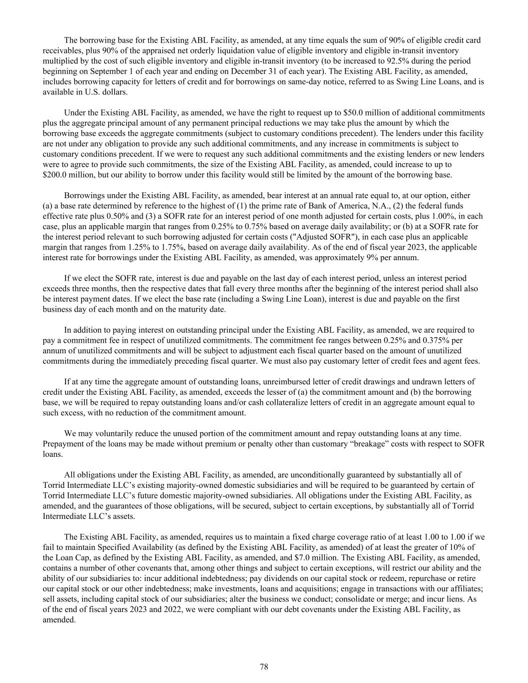 经修订的现有ABL融资的借款基数在任何时候等于符合条件的信用卡应收账款的90%之和,加上符合条件的库存和符合条件的在途库存的评估净有序清算价值的90%乘以该等符合条件的库存和符合条件的在途库存的成本(在每年9月1日开始至每年12月31日结束期间增加至92.5%)。经修订的现有ABL贷款包括信用证和同日通知借款的借款能力,称为周转额度贷款,以美元提供。根据经修订的现有ABL融资,我们有权要求最多5000万美元的额外承诺加上我们可能采取的任何永久性本金削减的本金总额加上借款基础超过承诺总额的金额(根据惯例先决条件)。该融资下的贷方没有任何义务提供任何此类额外承诺,任何增加的承诺均受惯例先决条件的约束。如果我们要求任何此类额外承诺,而现有贷方或新贷方同意提供此类承诺,经修订的现有ABL融资规模可能会增加至最多2亿美元,但我们在该融资下借款的能力仍将受到借款基础金额的限制。经修订的现有ABL融资下的借款按年利率计息,我们可以选择(a)基准利率,该基准利率是参照(1)美国银行最优惠利率、(2)联邦基金有效利率加0.50%和(3)一个月利息期的SOFR利率中的最高者确定的,经调整后的某些成本加1.00%,在每种情况下,加上基于日均可用性的范围为0.25%至0.75%的适用保证金;或(b)按根据某些成本调整的此类借款相关利息期的SOFR利率(“调整后SOFR”),在每种情况下加上基于日均可用性的范围为1.25%至1.75%的适用保证金。截至2023财年末,经修订的现有ABL融资下借款的适用利率约为每年9%。如果我们选择SOFR利率,利息在每个利息期的最后一天到期支付,除非一个利息期超过三个月,那么在利息期开始后每三个月下降的相应日期也应是付息日。如果我们选择基准利率(包括周转额度贷款),利息在每月的第一个工作日和到期日到期支付。除了根据经修订的现有ABL融资支付未偿还本金的利息外,我们还需要就未使用的承诺支付承诺费。承诺费范围为每年0.25%至0.375%的未使用承诺,每个财政季度将根据上一个财政季度的未使用承诺金额进行调整。我们还必须支付惯常的信用证费用和代理费用。如果在任何时候,经修订的现有ABL融资下的未偿还贷款、未偿还信用证提款和未提取信用证的总额超过(a)承诺金额和(b)借款基数中的较低者,我们将被要求偿还未偿还贷款和/或现金抵押信用证,总额等于该超额部分,不减少承诺金额。我们可能会自愿减少承诺金额的未使用部分,并随时偿还未偿还的贷款。除SOFR贷款的惯常“破损”成本外,可以在没有溢价或罚款的情况下提前偿还贷款。经修订的现有ABL融资项下的所有义务由Torrid Intermediate LLC现有的几乎所有拥有多数股权的国内子公司提供无条件担保,并将被要求由Torrid Intermediate LLC未来的某些国内拥有多数股权的子公司提供担保。经修订的现有ABL融资下的所有债务以及这些债务的担保,除某些例外情况外,将由Torrid Intermediate LLC的几乎所有资产作担保。经修订的现有ABL融资要求,如果我们未能保持经修订的现有ABL融资所定义的贷款上限的10%和700万美元中的至少较高者的特定可用性(由经修订的现有ABL融资所定义),我们必须保持至少1.00至1.00的固定费用覆盖率。经修订的现有ABL融资机制包含若干其他契约,除其他外,在某些例外情况下, 将限制我们和我们的子公司的能力:产生额外债务;支付我们的股本股息或赎回、回购或偿还我们的股本或我们的其他债务;进行投资、贷款和收购;与我们的关联公司进行交易;出售资产,包括我们子公司的股本;改变我们开展的业务;合并或合并;并产生留置权。截至2023和2022财年末,我们遵守了经修订的现有ABL融资下的债务契约。78