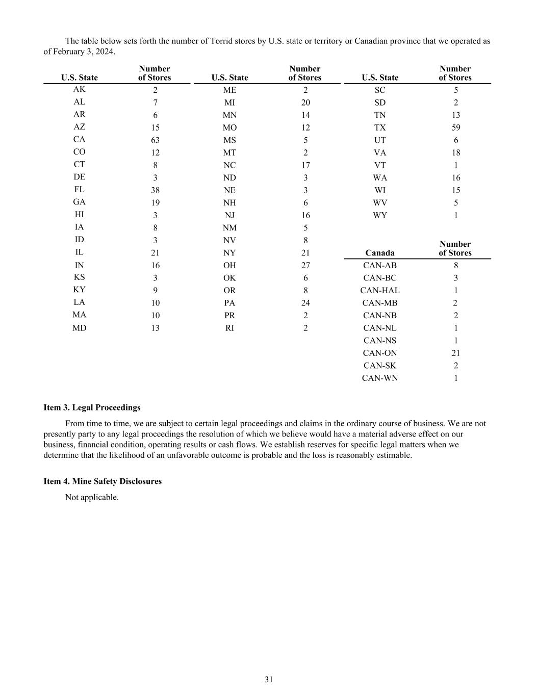 下表列出了截至2024年2月3日我们按美国各州或地区或加拿大省份运营的Torrid门店数量。美国州门店数量美国州门店数量美国州门店数量AK 2 ME 2 SC 5 AL 7 MI 20 SD 2 AR 6 MN 14 TN 13 AZ 15 MO 12 TX 59 加利福尼亚州 63 MS 5 UT 6 CO 12 MT 2 VA 18 CT 8 NC 17 VT 1 DE 3 ND 3 WA 16 FL 38 NE 3 WI 15 GA 19 NH6 WV 5 HI 3 NJ 16 丨WY 1 IA 8 NM 5 ID3 NV 8门店数量21 NY 21 Canada in 16 OH27 CAN-AB 8 KS 3 OK 6 CAN-BC 3 KY 9或8 CAN-HAL 1 LA 10 PA 24 CAN-MB 2 MA 10 PR 2 CAN-NB 2 MD 13 RI 2 CAN-NL 1 CAN-NS 1 CAN-ON 21 CAN-SK2 CAN-WN 1项目3。法律程序我们不时在日常业务过程中受到某些法律程序和索赔。我们目前没有参与任何我们认为会对我们的业务、财务状况、经营业绩或现金流量产生重大不利影响的法律诉讼。当我们确定不利结果的可能性很大并且损失可以合理估计时,我们会为特定的法律事务建立准备金。项目4。矿山安全披露不适用。31